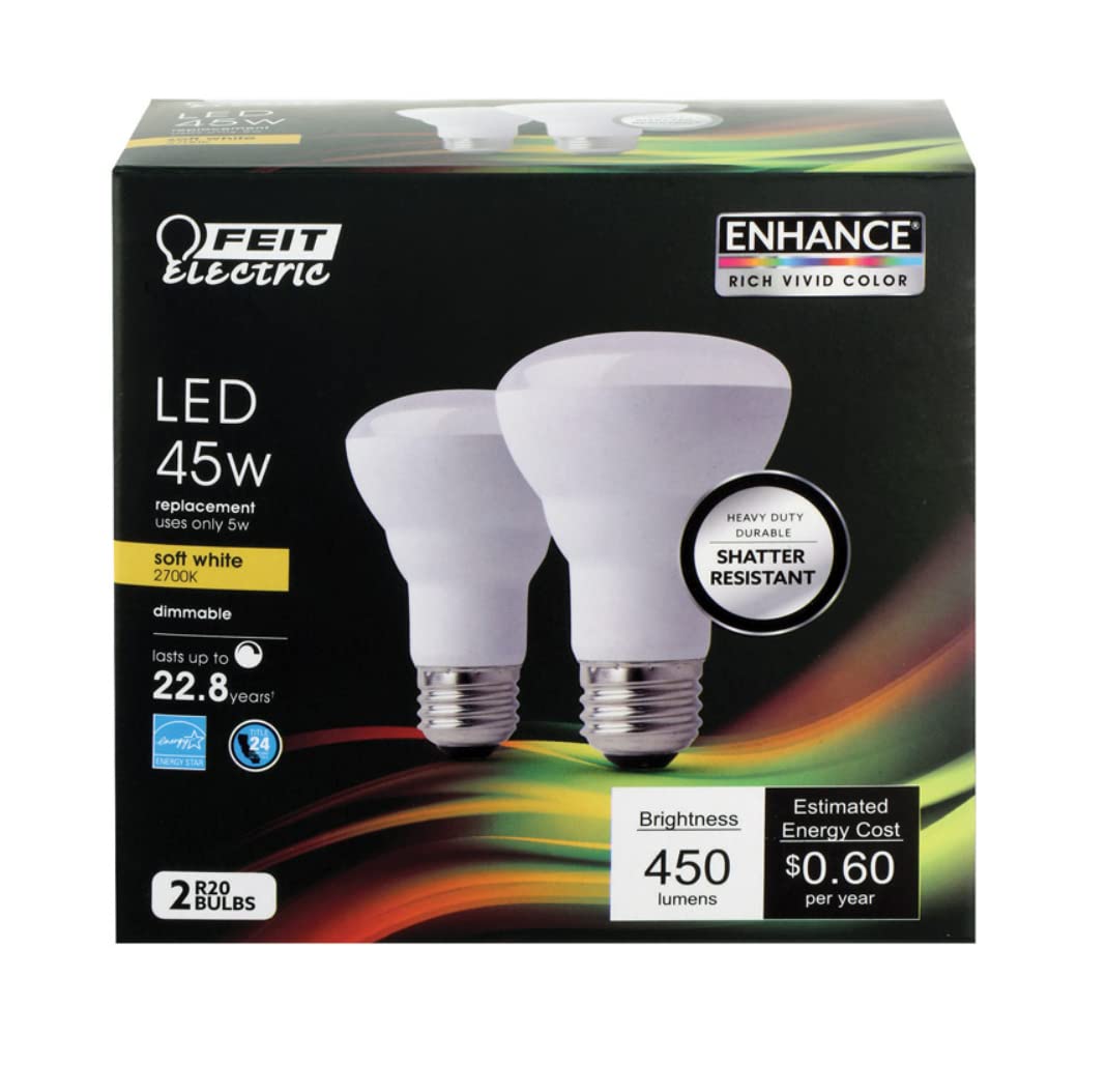 The Feit Electric LED Enhance product line features our highest quality energy efficient light. This soft white R20 dimmable reflector LED light bulb with a E26 medium base produces a similar light output while using less energy than a standard 45-watt incandescent light bulb. This high performance bulb also has a high (CRI) of 90+ so colors appear more realistic and vibrant. Get instant on to full brightness with relatively cool running performance. These Feit Electric BR30 bulbs have an average life of 25,000 hours/22.8 years are RoHS compliant, and are 100% mercury free. Choose a dependable LED bulb for general purpose residential or commercial applications. Suitable for enclosed fixtures or outdoor use.