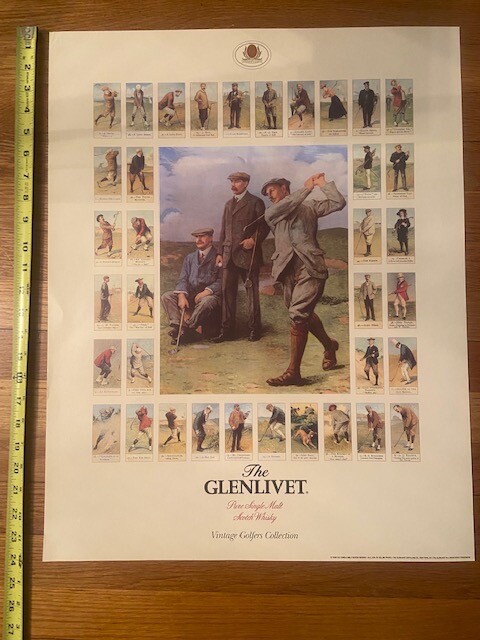 This is a golf poster from Glenlivet whiskey. It shows a collection of vintage golfer( I believe tobacco) cards on the poster with a large print of a famous painting of the Golf Triumvirate in the center. The poster is about 19" W and 24" L. There are a few small imperfections as you can see in the pictures. You be the judge. It will be shipped in a poster tube. Thanks and the shipping is for the continental U.S., elsewhere will be calculated.