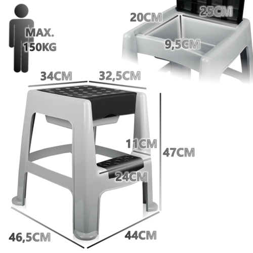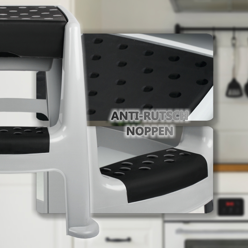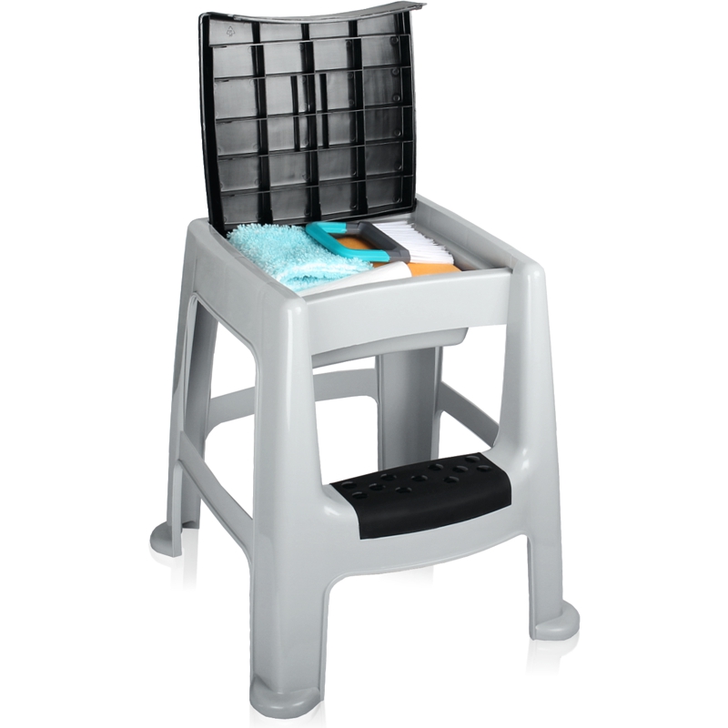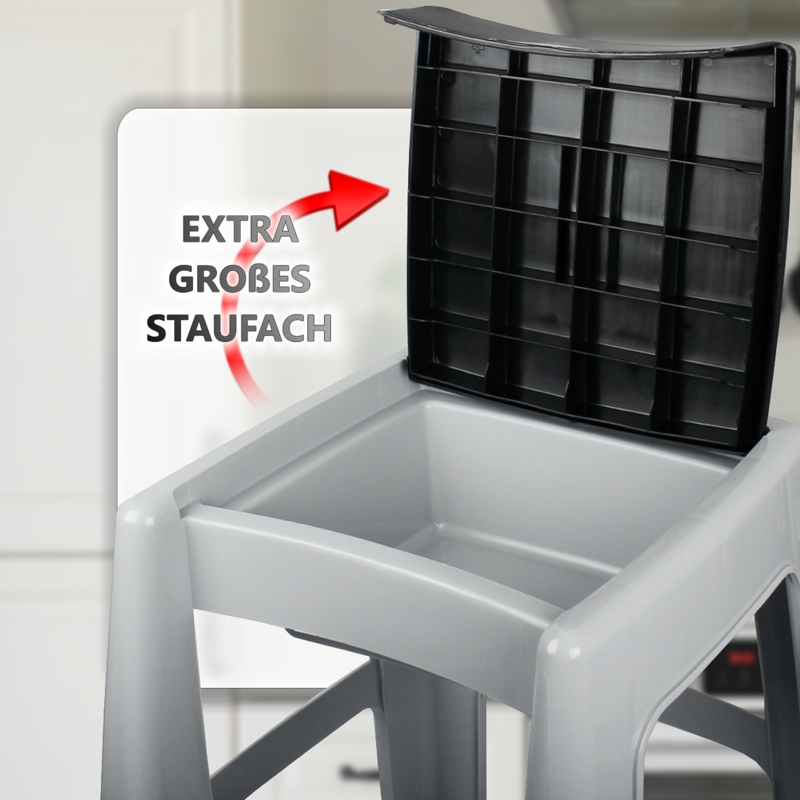 Mit diesem hilfreichen Tritthocker können Sie beruhigt in die Höhe steigen. Der standfeste Trittschemel hat 2 breite Trittflächen mit rutschfesten Noppen und gummierte Füße für einen sicheren Stand. Die Sitz- bzw. Trittfläche kann aufgeklappt werden und bietet Ihnen ein praktisches Staufach. Das schlichte Design fügt sich wunderbar in Ihr Zuhause ein und dank einem Eigengewicht von nur 2 kg kann der Tritt mit Leichtigkeit überall platziert werden. Ob im Haushalt, Büro, Bad, Keller, Garten oder in der Garage der durchdachte Tritthocker ist überall einsatzbereit.