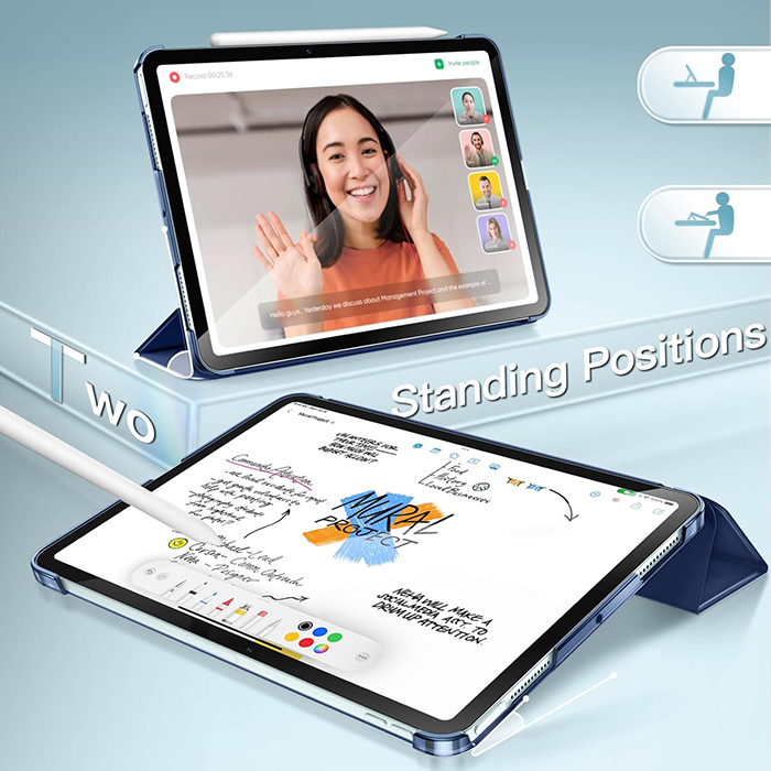 Vorderes Cover kann umgeklappt werden um die Schutzhülle zu einem Betrachtungs- und Tastatur-Aufsteller zu verwandeln.