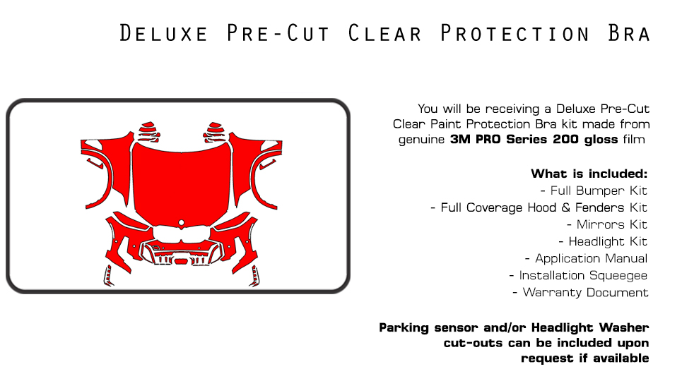 Q: Which areas of my car will be protected? A: Our Deluxe Kit will include pieces for the bumper, hood (full coverage size), fenders (full coverage size), headlights, and mirrors.