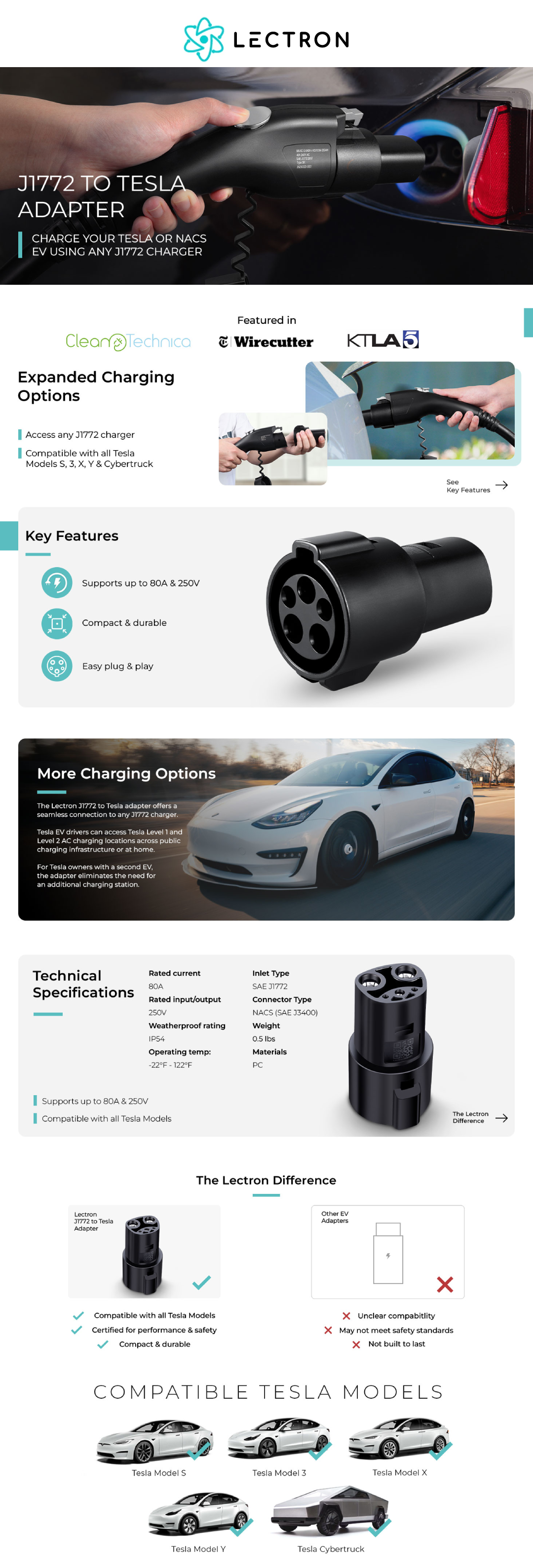 Expand your charging horizons with the Lectron J1772 to Tesla Adapter. Designed to connect SAE J1772 chargers to all Tesla models and EVs within the NACS alliance, this adapter supports both Level 1 and Level 2 charging, enhancing your access to a wide range of charging stations. It handles up to 240V AC and 80A of current, ensuring robust performance even in extreme temperatures from -22°F to 122°F (-30°C to 50°C). The user-friendly plug-and-play design fits conveniently in your glove box, making it ideal for on-the-go use. Engineered for durability, the adapter features an IP67 weatherproof rating and holds TUV/UL 2251 certifications, providing reliable and safe charging in any environment.