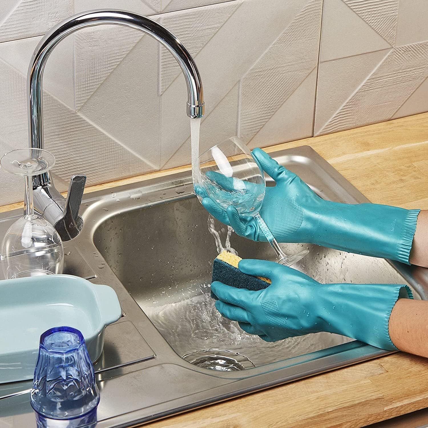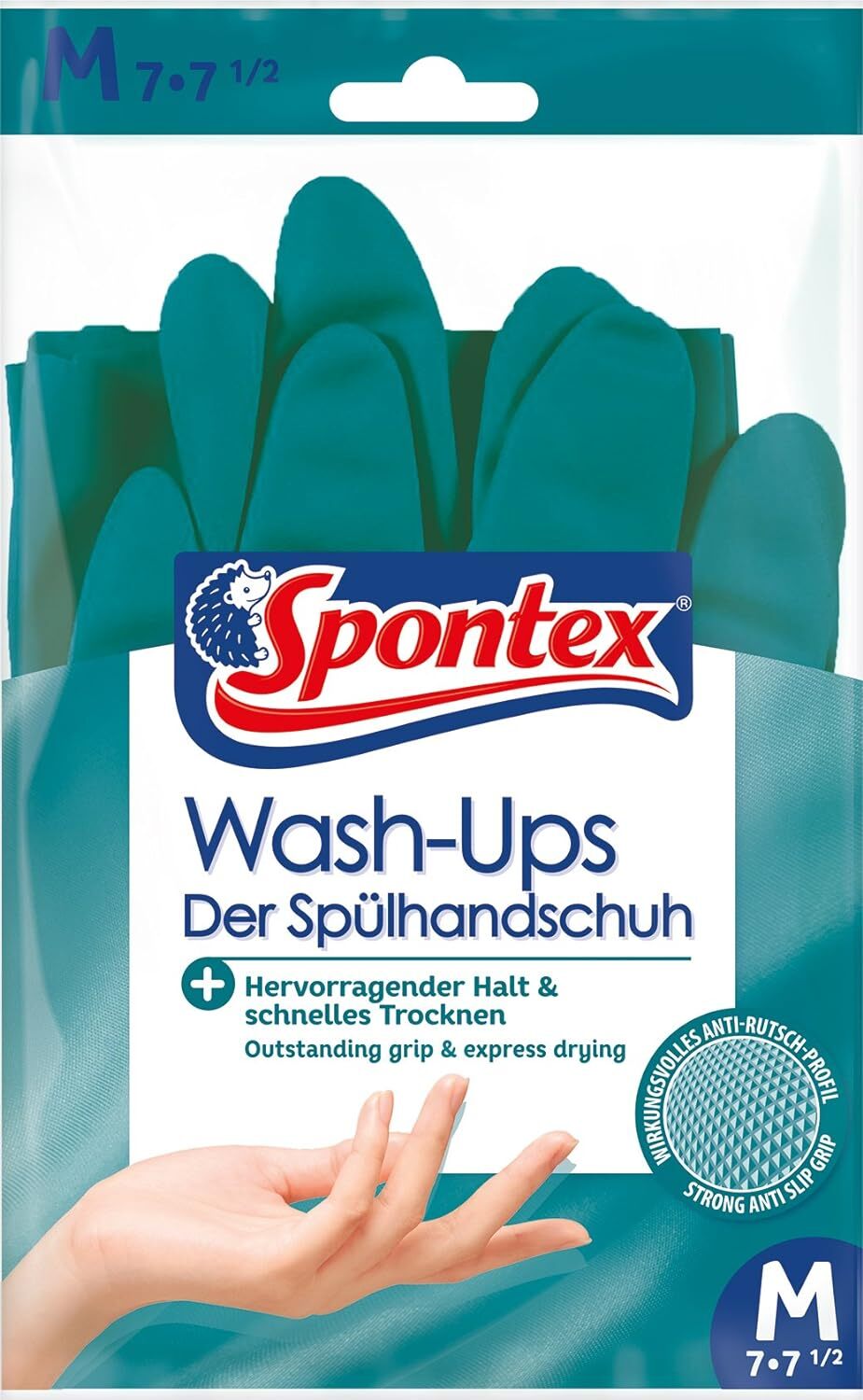 Spontex Handschuh Wash-Ups – Der Spülhandschuh für optimale Geschirrkontrolle. Dieser Spülhandschuh wurde speziell entwickelt, um den täglichen Abwasch zu erleichtern und die Hände vor dem Kontakt mit heißem Wasser und Spülmittel zu schützen. Das Spontex Anti-Rutsch-Profil mit seinen griffigen Noppen, sorgt für sicheres Halt des Geschirrs. Mit der Spontex Schnell-Trocken- Technologie trocknet den Handschuh fast doppelt so schnell wie herkömmliche Handschuhe, so dass er nach Gebrauch zügig wieder verstaut werden kann. Der Handschuh ist geschmeidig und dünn für extra Komfort und gutes Tastempfinden. Hergestellt aus Naturkautschuklatex und synthetischen Material mit Baumwollbeflockung im Inneren.