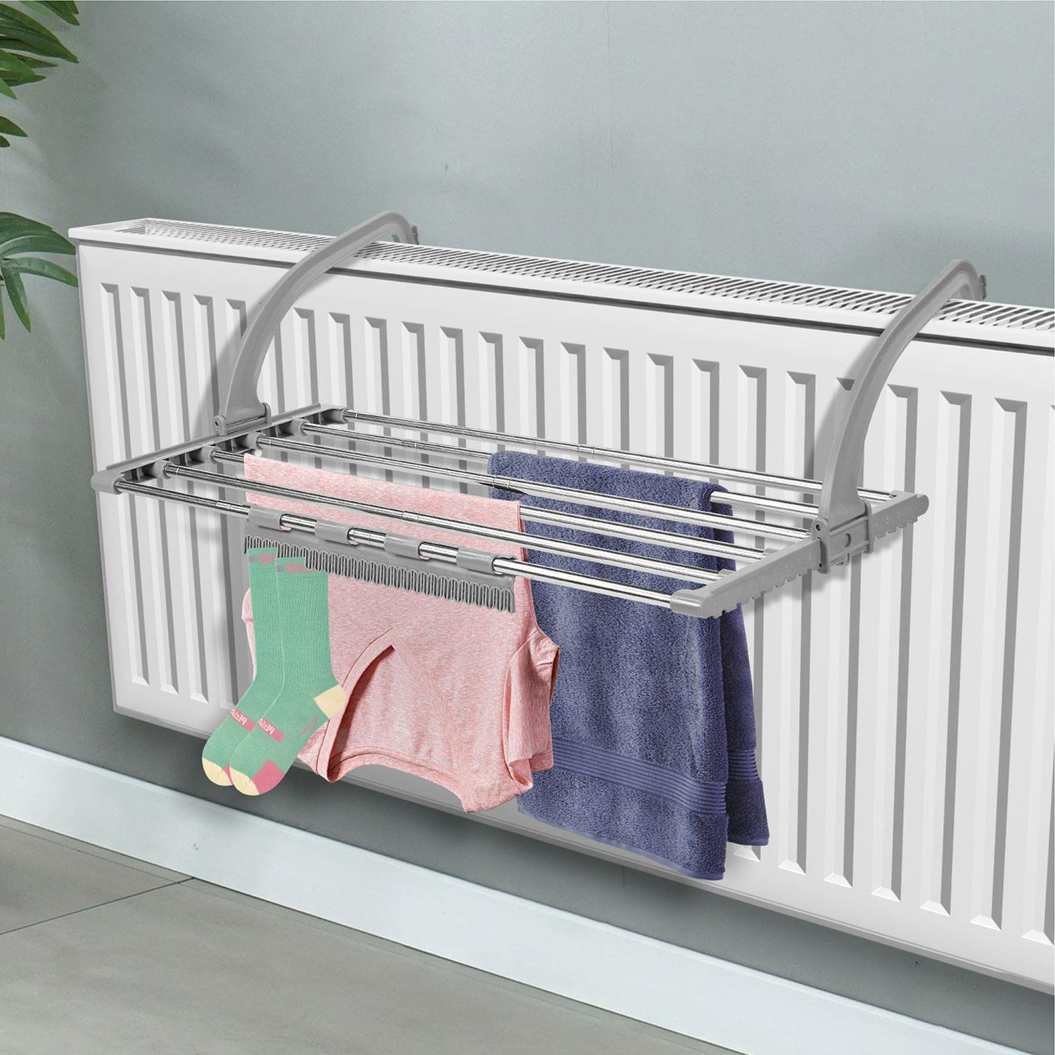 Dry your clothes efficiently with the Taylor & Brown 5-Bar Telescopic Radiator Clothes Airer. Designed with an extendable frame and adjustable arms, this versatile airer fits most radiators, balconies, and bath edges, making it perfect for compact living spaces. It includes a handy sock clip to hold up to 13 pairs, maximizing your drying space.