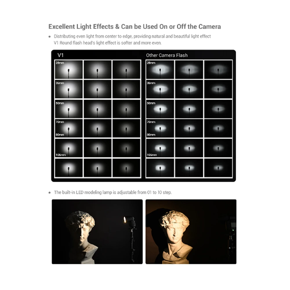 The professional Godox V1S camera flash speedlite(Sony version), with circular lamp head, uniform and soft lighting, great stereo perception, provide you extraordinary photographic effects.