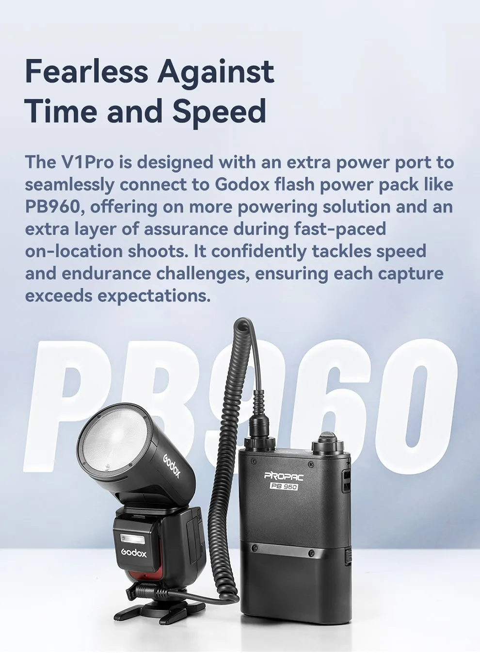 The V1Pro is designed with an extra power port to seamlessly connect to Godox flash power pack like PB960 (Sold Seperately), offering on more powering solution during fast-paced on-location shoots.
