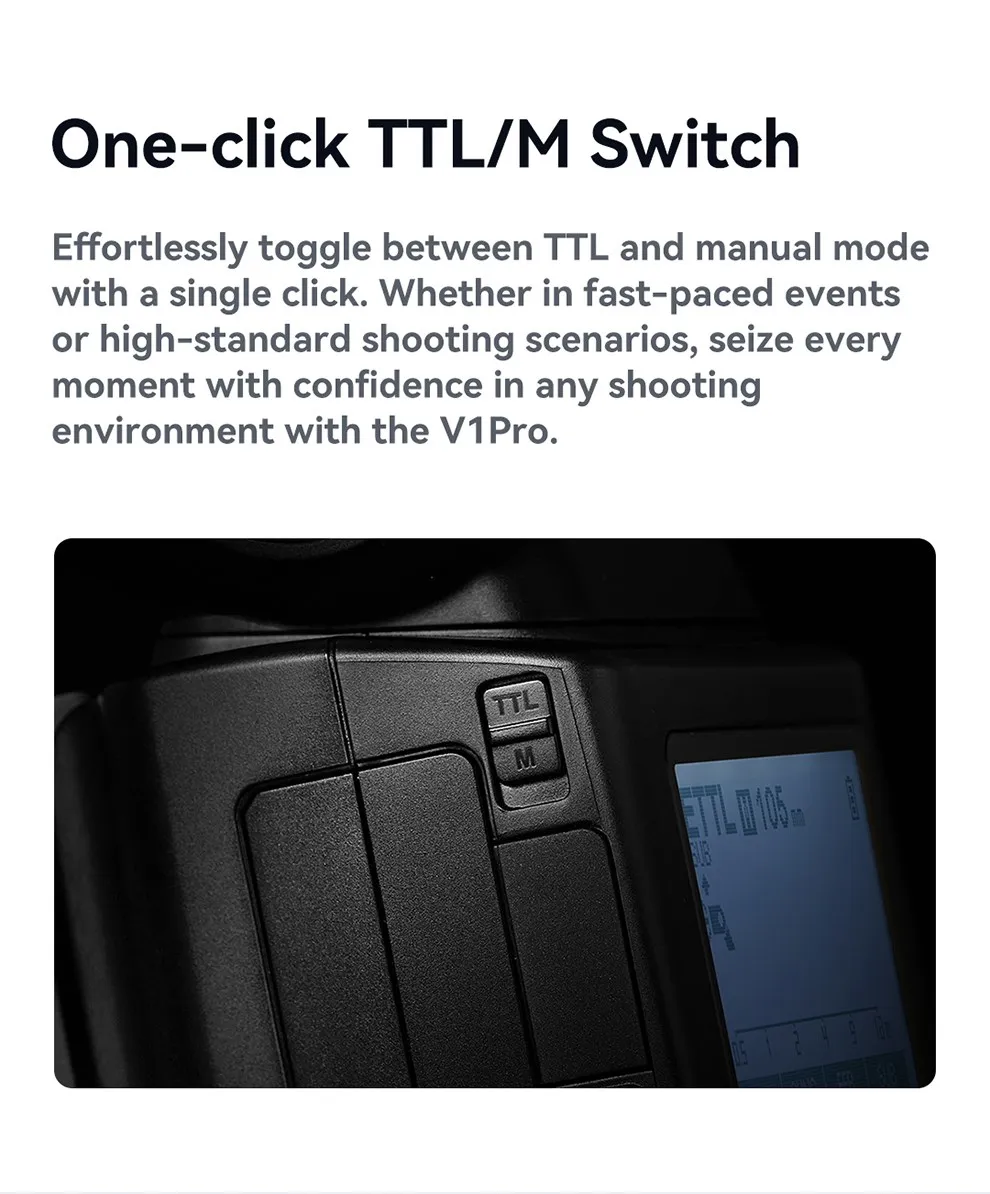 Effortlessly toggle between TTL and manual mode with a single click. Whether in fast-paced events or high-standard shooting scenarios, seize every moment with confidence in any shooting environment with the V1Pro.