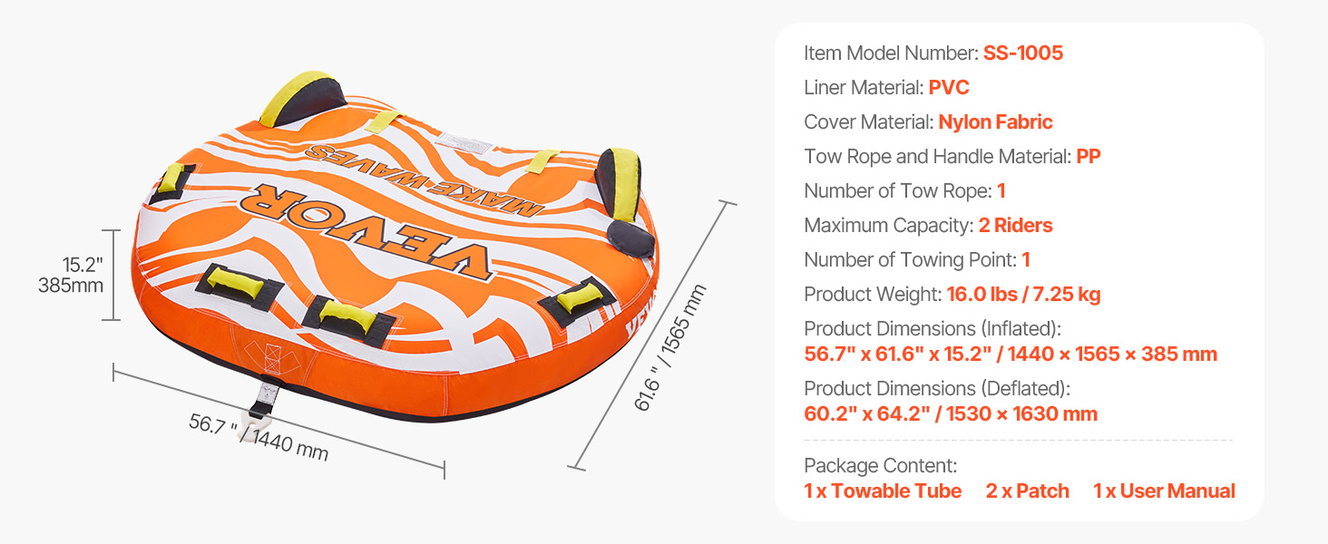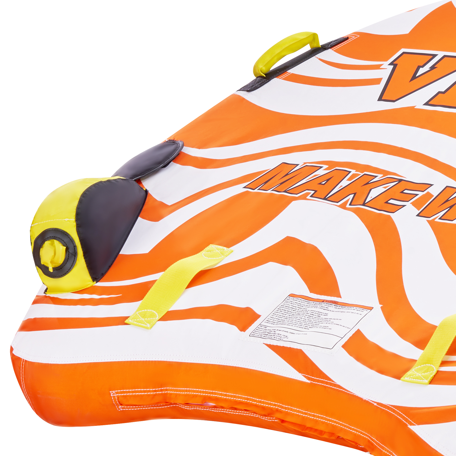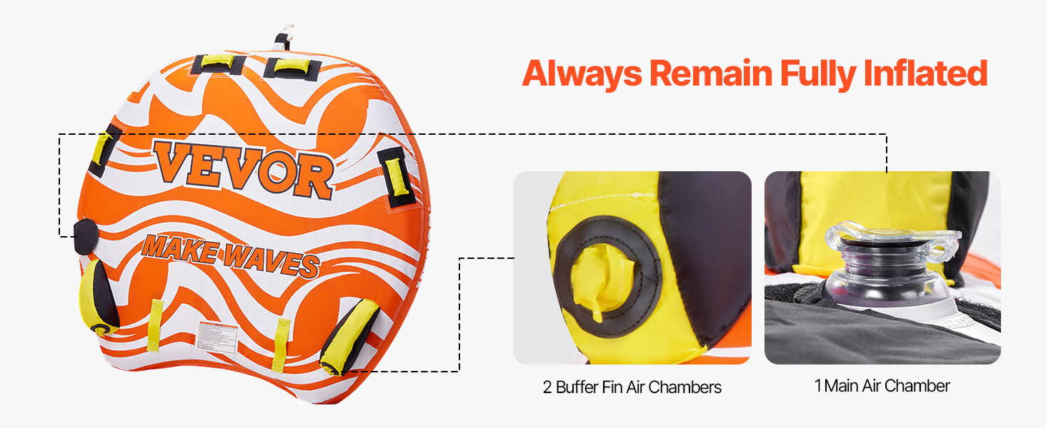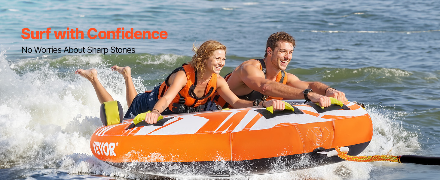 - Surf with Confidence: Our towable tube is covered with double-stitched, high-density nylon fabric and features a durable PVC bladder. Built with UV-resistant, age-resistant materials, this water sport towable lets you enjoy thrilling water adventures in seas, lakes, and rivers. (PLEASE NOTE: 1. After use, please deflate the product and store it. 2. Avoid prolonged exposure to direct sunlight, as it may lead to bursting and cracking.)