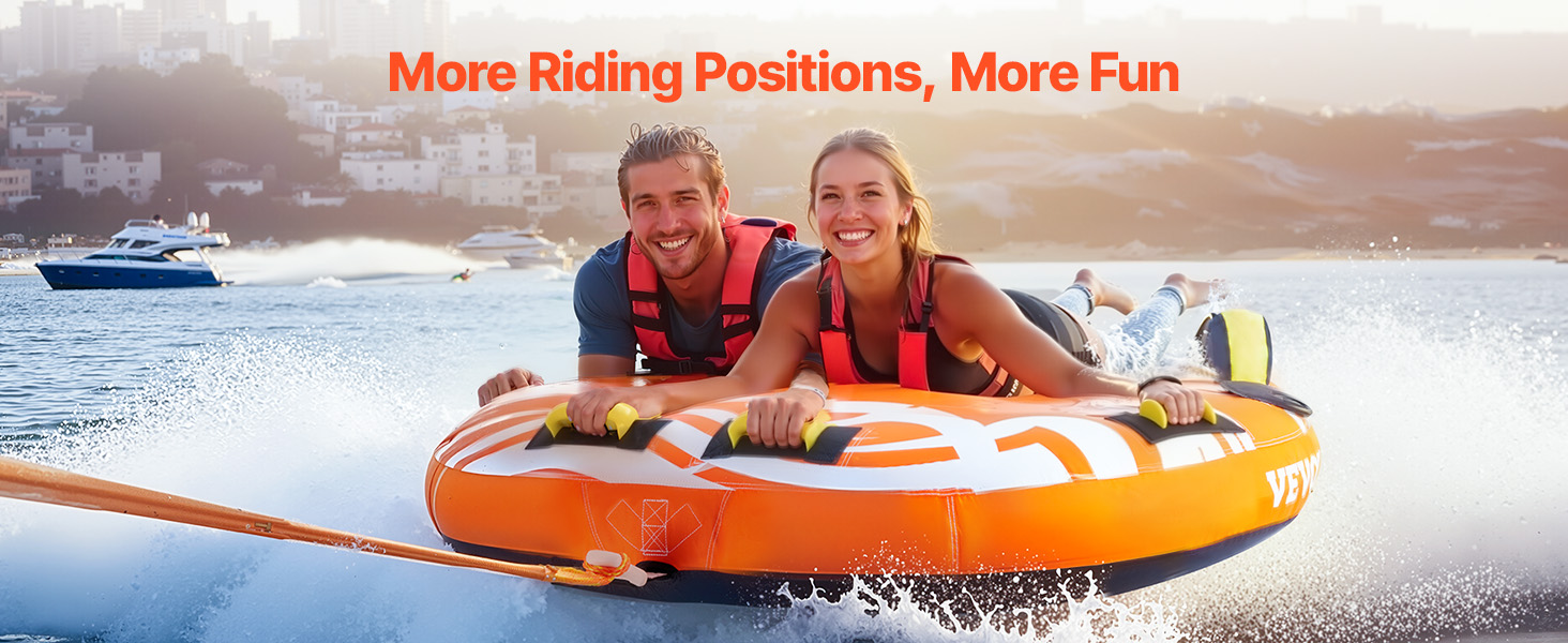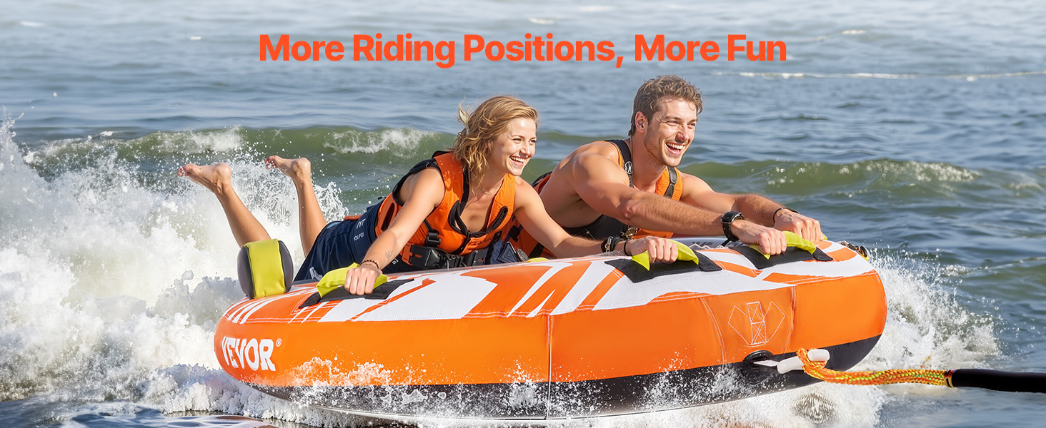 Experience the ultimate water adventure with our 2-rider towable tube for boating. Built for both fun and security, it allows you to enjoy your water activities with confidence. Featuring comfortable grip handles and boarding handles, it ensures a stable ride and easy re-entry after a splash.