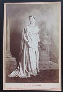 Beautiful actress in costume wearing Greek clothing as "Electra". Advertising card for using "Electro-Photography" by the London Stereoscopic Co. Prize medal backstamp for portraiture at the 1873 Vienna Exhibition.