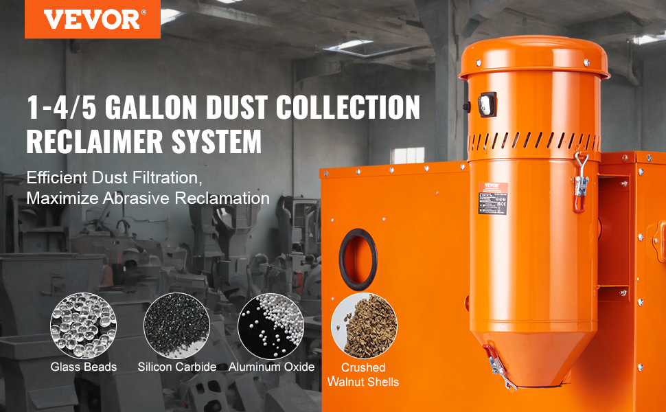 VEVOR dust collection reclaimer boasts 1.8 gallon capacity, providing an efficient solution for filtering dust during your sandblasting tasks. From aluminum oxide, glass beads, silicon carbide to walnut shells, it effortlessly handles them all, ensuring a consistently clean work environment.