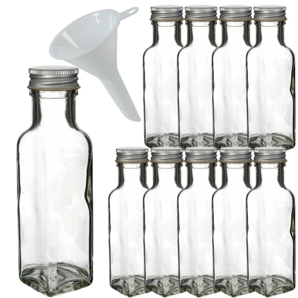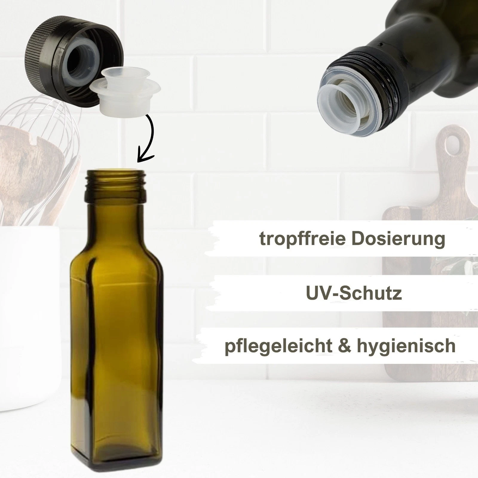 Die Flaschen bestehen aus robustem Grün- / Braunglas, das den Inhalt zuverlässig vor schädlicher UV-Strahlung schützt und so die Qualität und Frische länger bewahrt. Der praktische Ausgießer mit Verschlusskappe sorgt für eine einfache Dosierung und verhindert ungewolltes Tropfen oder Auslaufen.