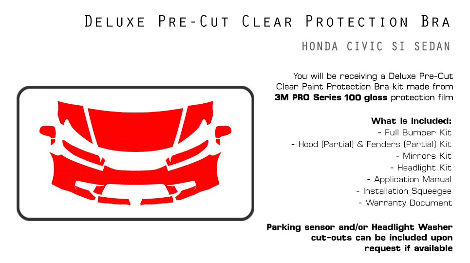 Q: Which areas of my car will be protected? A: Our Deluxe Kit will include pieces for the bumper, hood (partial size), fenders (partial size), headlights, and mirrors.