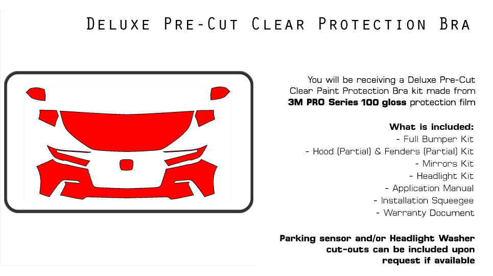 Q: Which areas of my car will be protected? A: Our Deluxe Kit will include pieces for the bumper, hood (partial size), fenders (partial size), headlights, and mirrors.