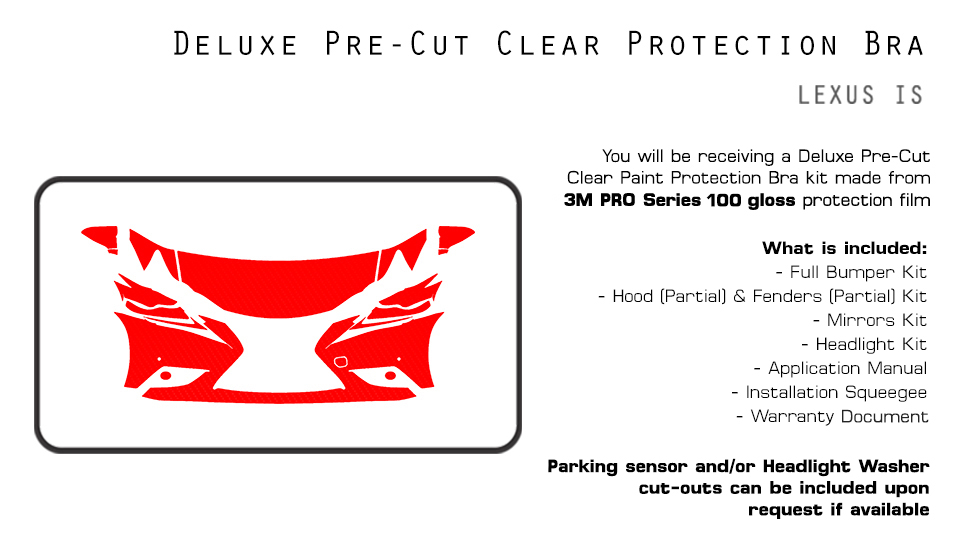 Q: Which areas of my car will be protected? A: Our Deluxe Kit will include pieces for the bumper, hood (partial size), fenders (partial size), headlights, and mirrors.