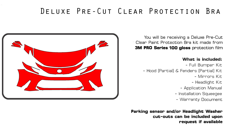 Q: Which areas of my car will be protected? A: Our Deluxe Kit will include pieces for the bumper, hood (partial size), fenders (partial size), headlights, and mirrors.