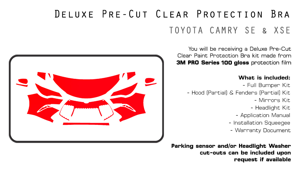 Q: Which areas of my car will be protected? A: Our Deluxe Kit will include pieces for the bumper, hood (partial size), fenders (partial size), headlights, and mirrors.