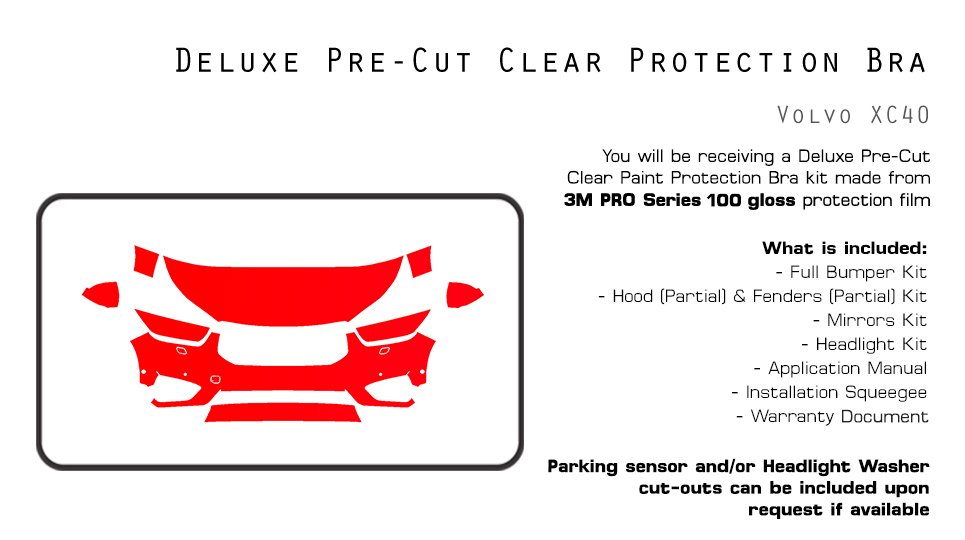Q: Which areas of my car will be protected? A: Our Deluxe Kit will include pieces for the bumper, hood (partial size), fenders (partial size), headlights, and mirrors.