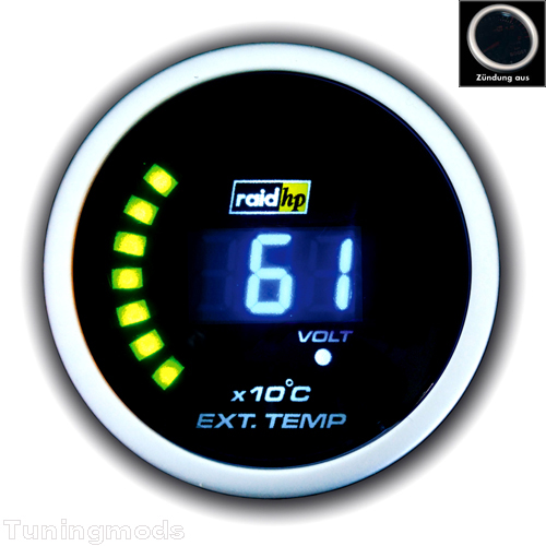 BESCHREIBUNG: - 52mm (2 Zoll) Raid HP Night Flight Digital Blue Auspuff-Abgastemperatur Anzeige mit weißer LED Beleuchtung - Komplettset mit Geber, Anschlussmaterial und Einbauhinweis - Scanfunktion: Zündung AN, LED Balken fährt hoch und wieder zurück bevor der tatsächliche Wert angezeigt wird - Sowie Integrierte Voltanzeige: Zündung AN, 50 Sekunden Anzeige der Bordspannung, danch wechselt die Anzeige automatisch auf Digital und den jeweiligen Wert des Instrumentes, alle 10 Minuten wird über die Digital Anzeige die Borspannung angezeigt (Volt-Modus). Nach ca. 50 Sekunden wird wieder der Instrumneten Wert angezeigt (Instrument-Modus) - Im Volt-Modus kann der Instrumenten Wert über die LED Balken abgelesen werden - Die automatische Umschaltung in Volt-Modus lässt sich auf Wunsch auch abschalten - Schutzfunktion: wird der kritische Bereich länger als 3 Sekunden über-oder unterschritten, so warnt die Digital Anzeige durch blinken des Wertes (fällt die Bordspannung unter 11 Volt warnt eine rote LED und die Anzeige springt automatisch in den Volt-Modus um die aktuelle Borspannung anzuzeigen) - Wenn die Anzeige ohne Strom ist, ist das Glas schwarz und die Anzeige unsichtbar - Mit Strom leuchtet die LED Beleuchtung, das schwarze Glas verschwindet und das Display wird sichtbar - LED Display mit blauen Ziffern - Der Geber kann z.B. am Abgaskrümmer befestigt werden - Anzeigebereich 0 - 1250 °C - Bereiche. GRÜN: 300 - 650 °C, GELB: 700 - 850 °C, ROT: 900 - 1250 °C