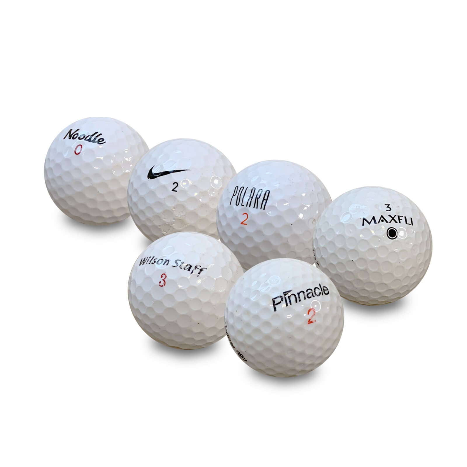 - Assorted Store Line Mix – Our mix may include a variety of retail store line golf balls brands like Top Flite, Maxfli, Pinnacle, Noodle, Wilson, Spalding & more—no set ratio, just a solid mix of balls to keep you swinging.