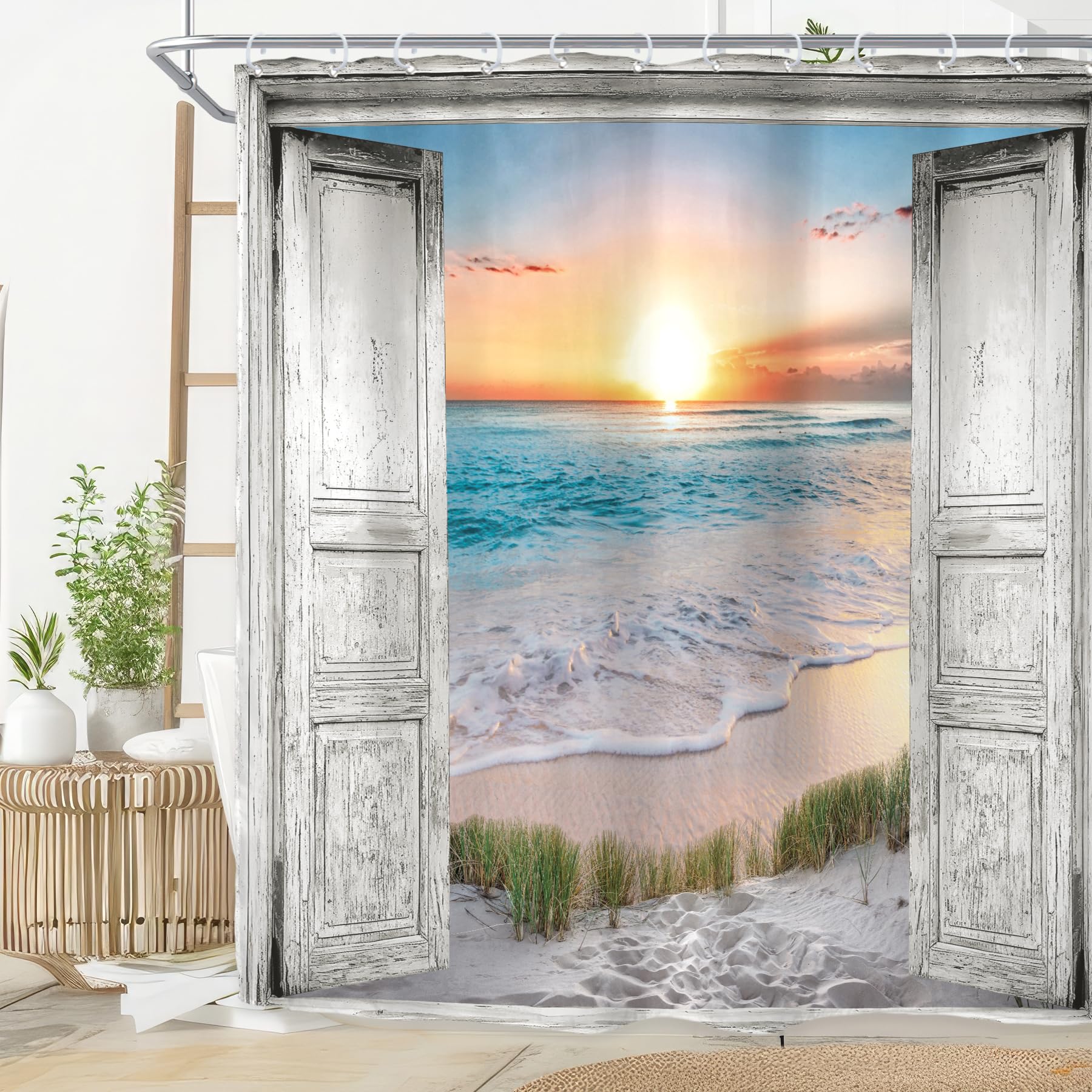 Ocean Beach Grey Barn Door Shower Curtain for Bathroom Decor 72Wx72H Hawaiian Sunset Scenery Sea Wave Retro Wood Rustic Nature Art Printed Fabric Polyester Waterproof 12 Pack Plastic Hooks