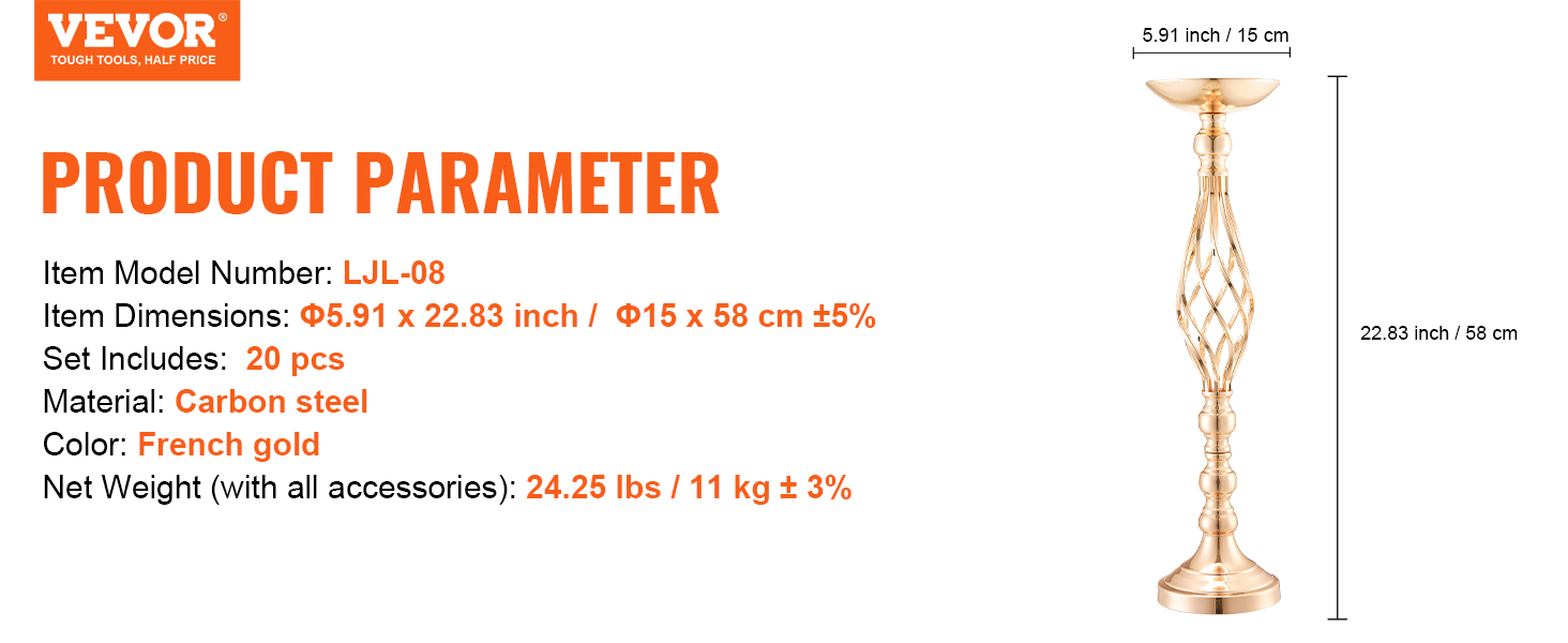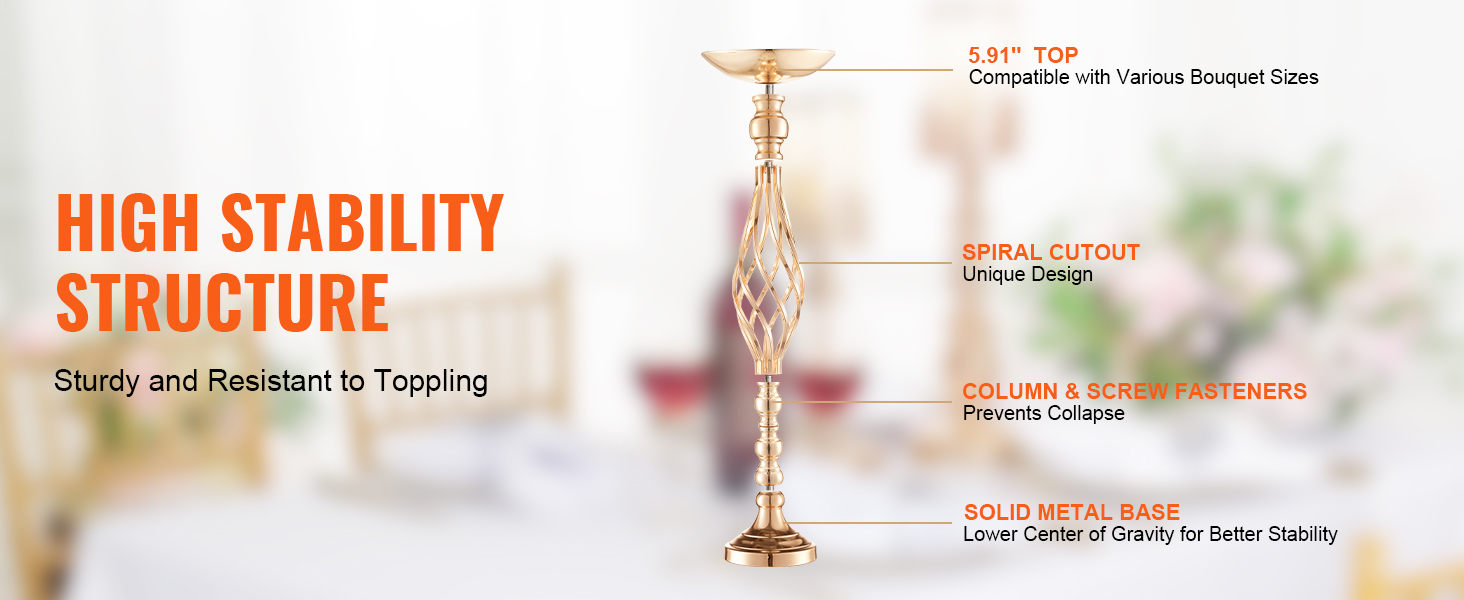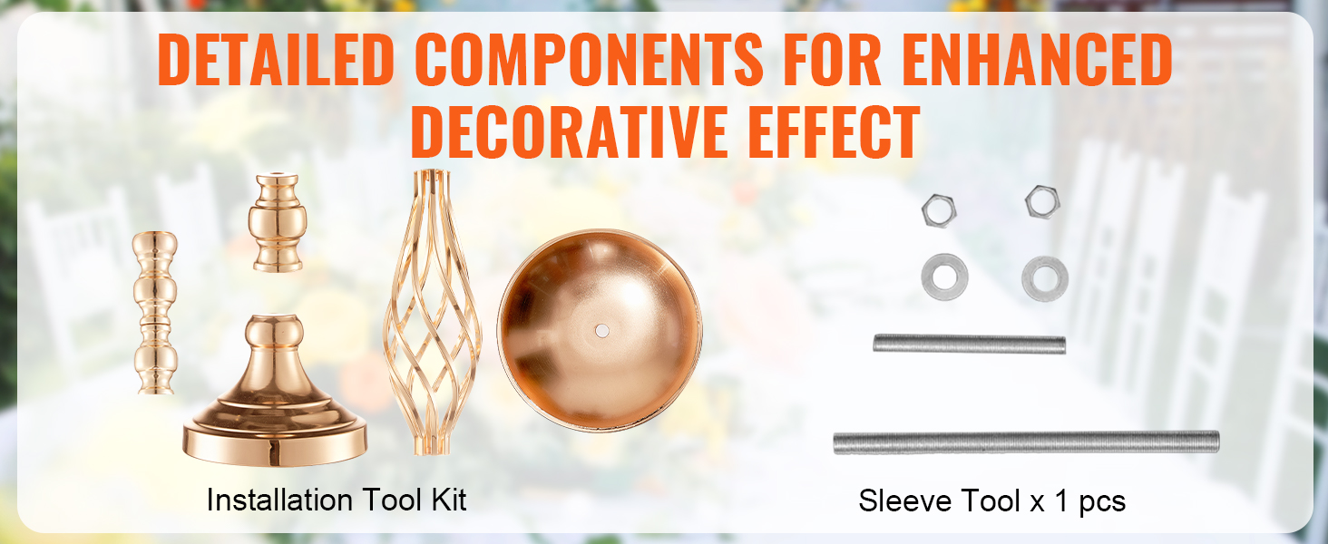 High-Quality Material: Made from premium carbon steel, this wedding floral stand is resistant to deformation and built to last. The surface is treated with a French gold electroplating process, providing a bright finish with vivid colors that are both attractive and easy to clean. It employs screw-fastened connections to prevent pin deformation, ensuring greater stability after assembly.