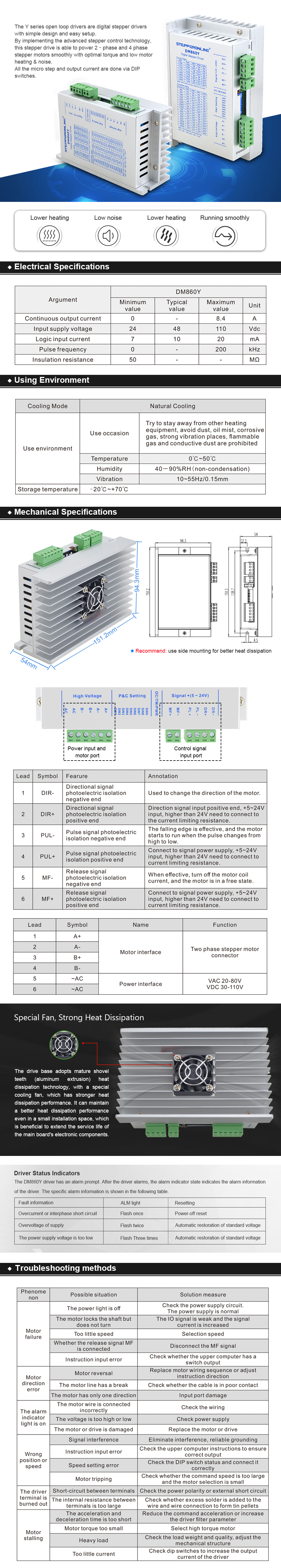 - 1 x DM860Y: Y Series Digital Stepper Driver 2.4-7.2A AC18V-80V/DC 36V-110V for Nema 34 Motor
