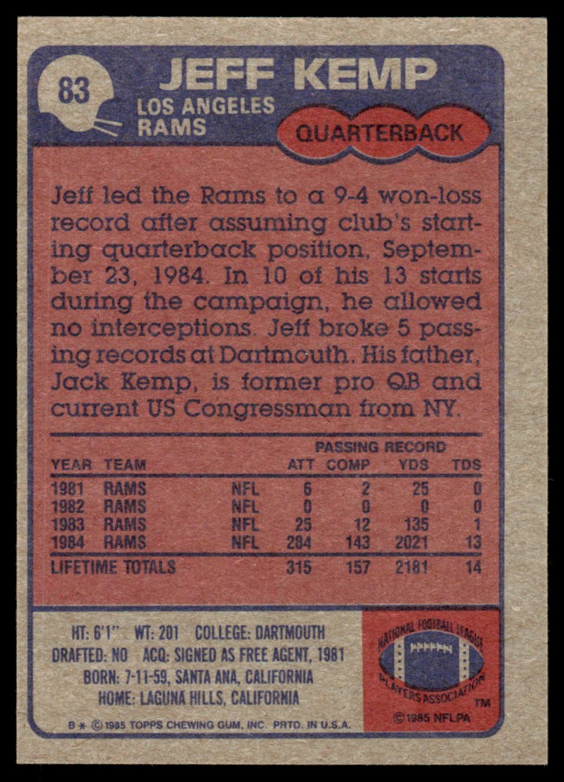 1985 Topps Jeff Kemp Rookie Los Angeles Rams #83