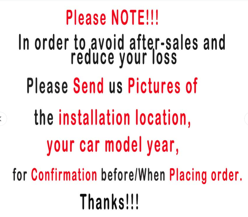 In order to avoid after-sales and reduce your loss, please send us pictures of the installation location, your car model year for confirmation before or when placing the order.