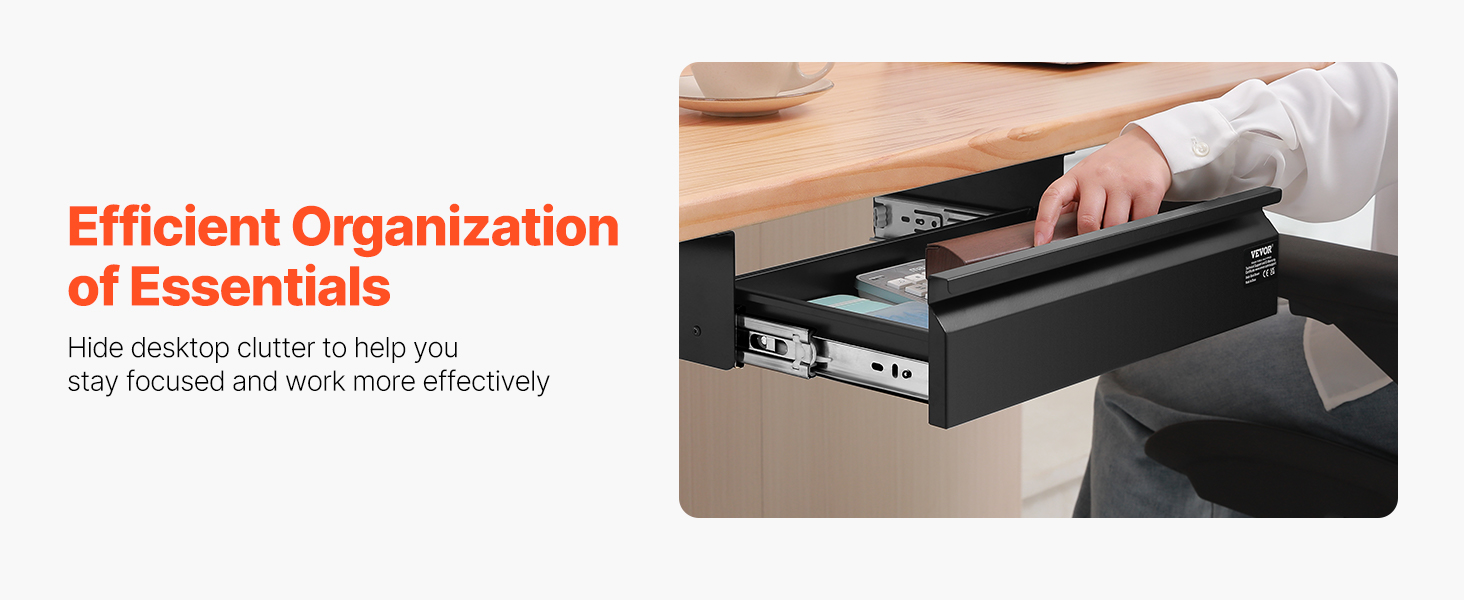 - Efficient Organization: Say goodbye to cluttered desktops! Store your most-used items or tools in this undermount pencil drawer to keep your desk tidy and boost productivity. With a EVA drawer liner, your items are cushioned, reducing the risk of scratches. Simple assembly means you can follow our instruction manual and do it on your own. (For easier installation, it's recommended to flip the desk surface to secure the drawer, saving you effort.)