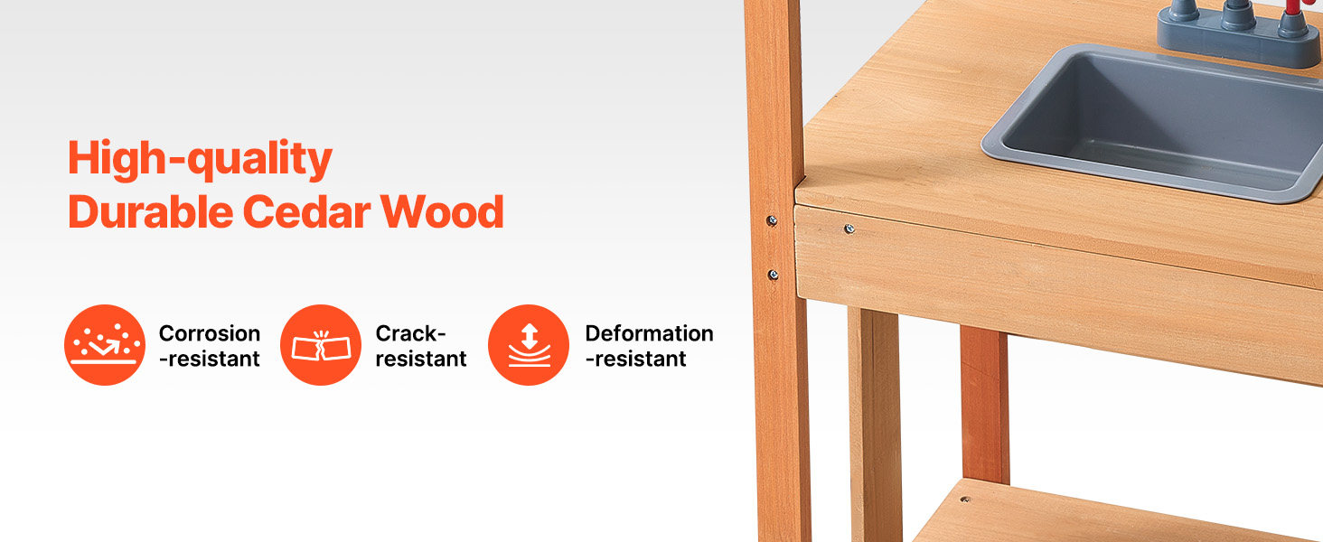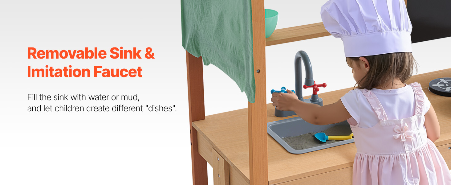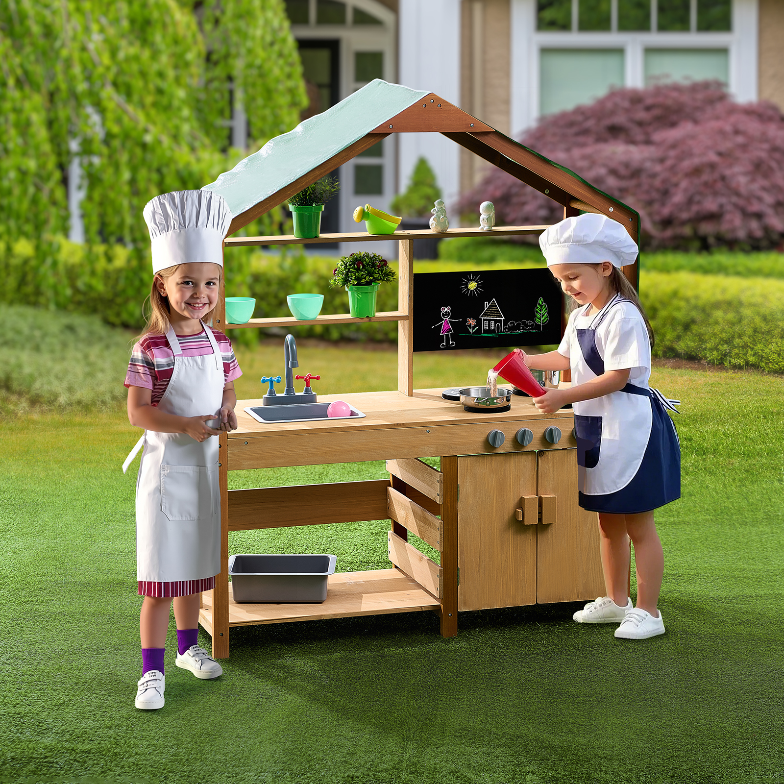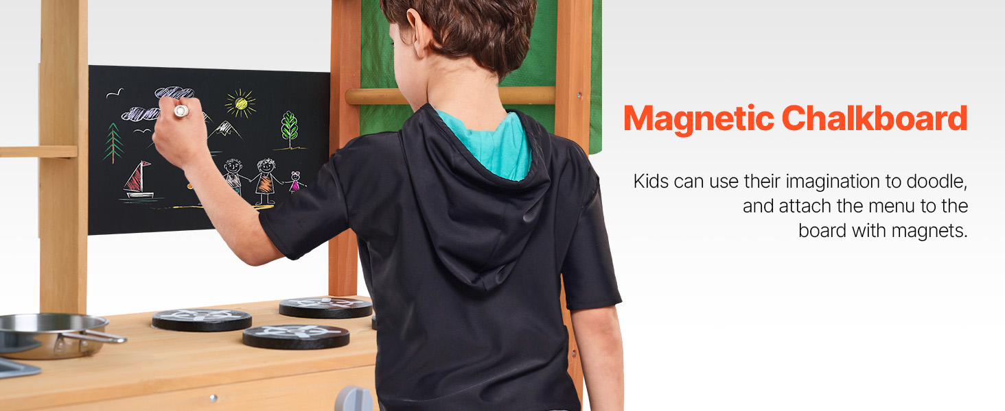 Our wood outdoor kitchen supports a variety of fun activities like washing, cooking, and gardening. The magnetic chalkboard encourages creativity and writing.