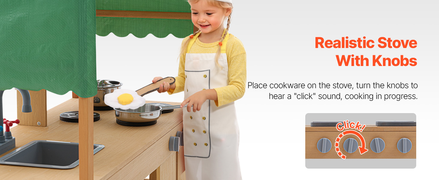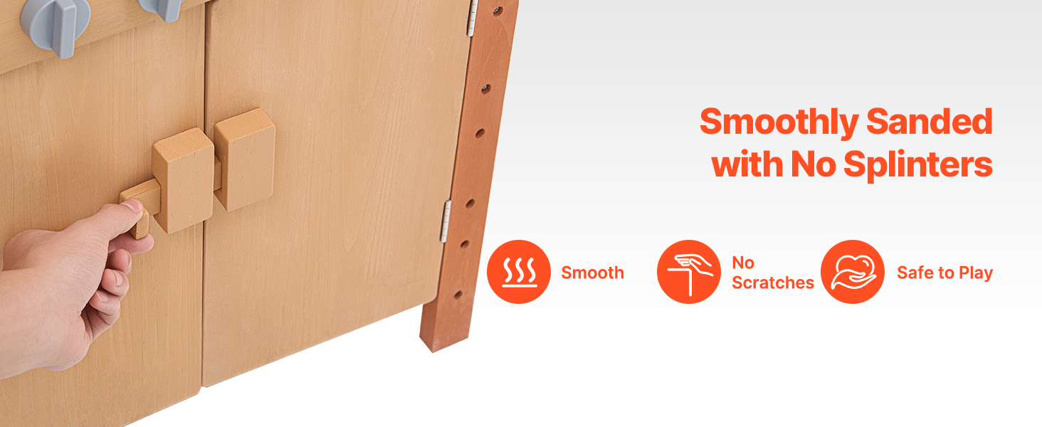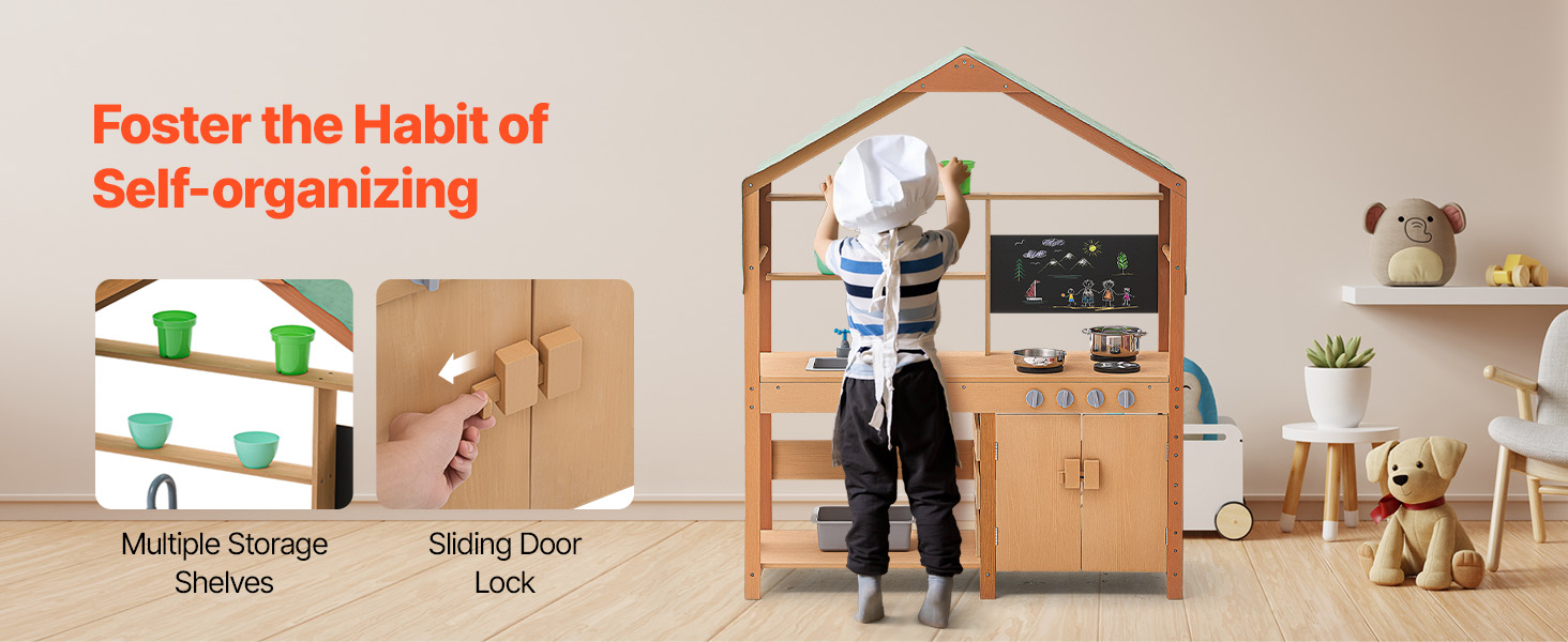 - Promote Independence: The pretend play outdoor kitchen is designed with versatile storage cabinets, offering ample space and open shelves so kids can arrange their items according to their preferences. This helps them develop organizational skills and learn to tidy up independently. The cabinet doors feature sliding latches to keep them closed and can also serve as handles, making it easier for kids to open the doors and access their belongings