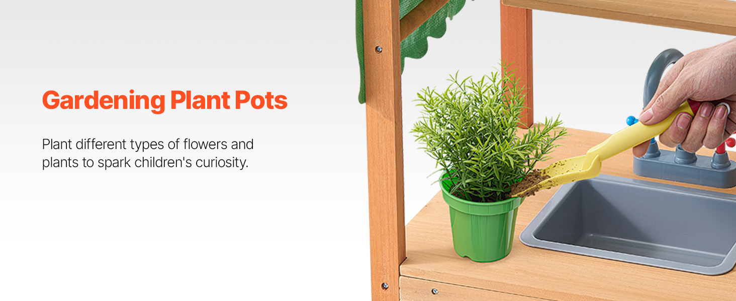 - Fun Developmental Gift: This wooden toy playset comes with 8 kitchen accessories, including: 1 frying pan, 1 pot with a lid, 2 flowerpots, 2 bowls, and 2 removable sinks. It makes the perfect birthday or holiday gift for children! With a 20.5-inch high countertop, kids can easily place and organize items on their own, improving their hand-eye coordination. The spacious workspace allows kids to play with friends, boosting teamwork and social skills while having fun