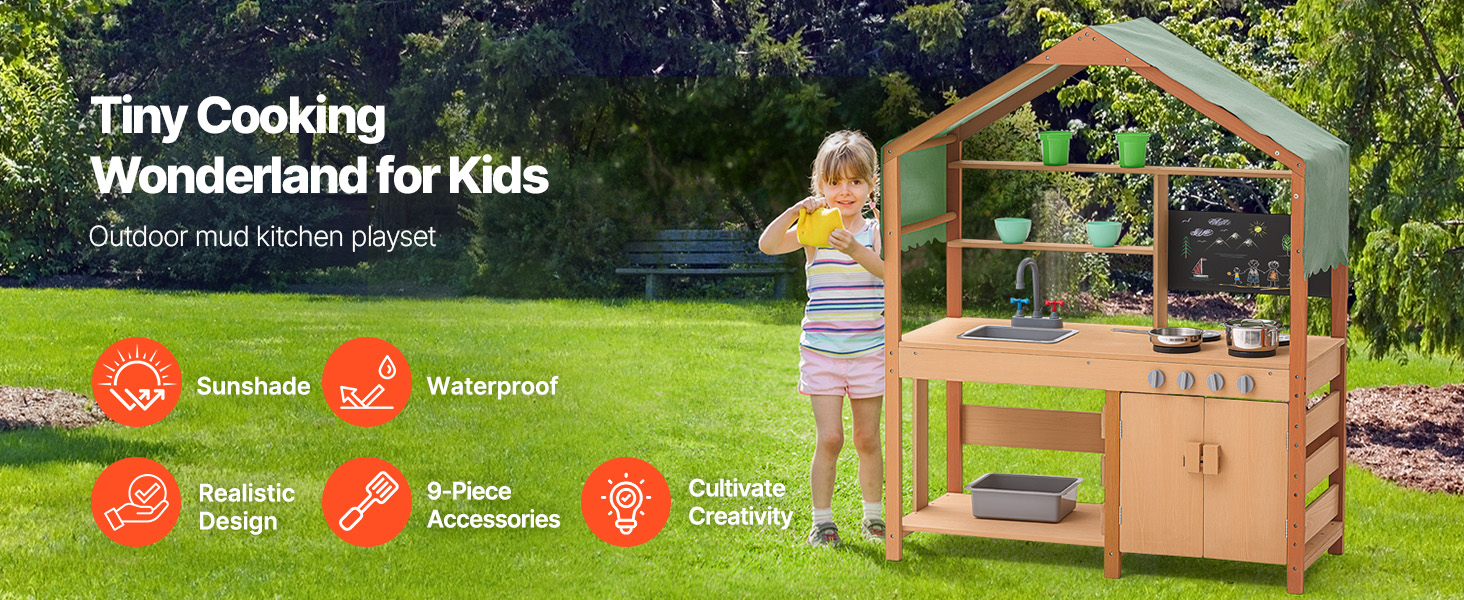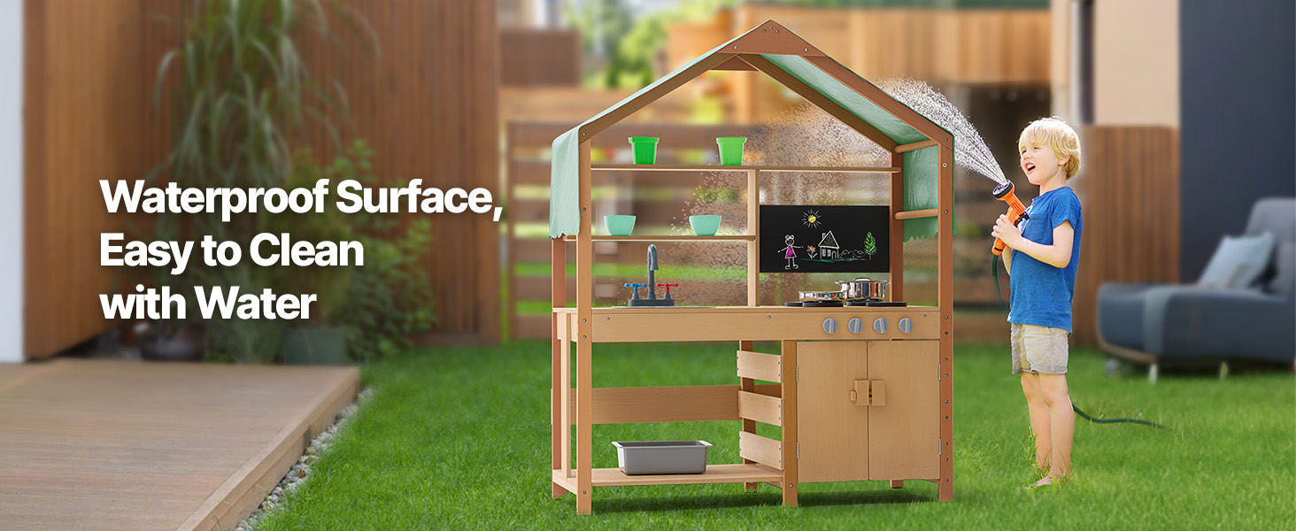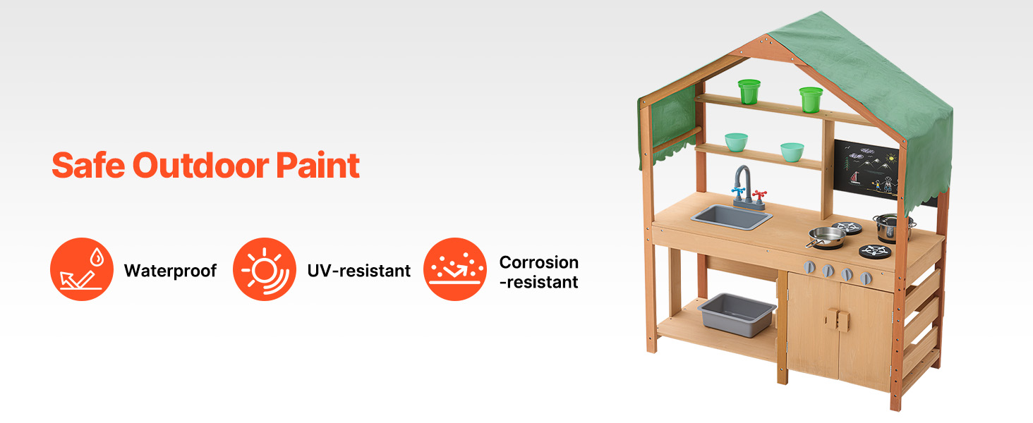 This toddler play kitchen is treated with outdoor-grade paint for water and corrosion resistance, providing a shaded area for kids to play. It's idleal for use in gardens, backyards, and lawns.