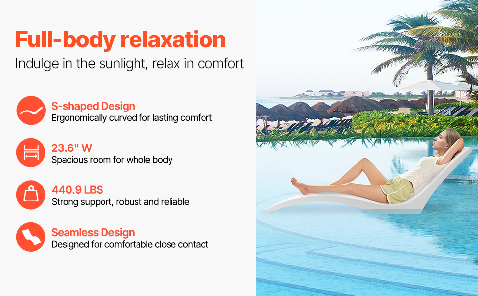 Ready for summer? This pool chaise chair features an S-shaped design for spine support, ensuring comfort whether lying flat or sideways. Made of durable, easy-to-clean PE material, it withstands yellowing and aging. Its stylish design suits both residential and commercial pools.