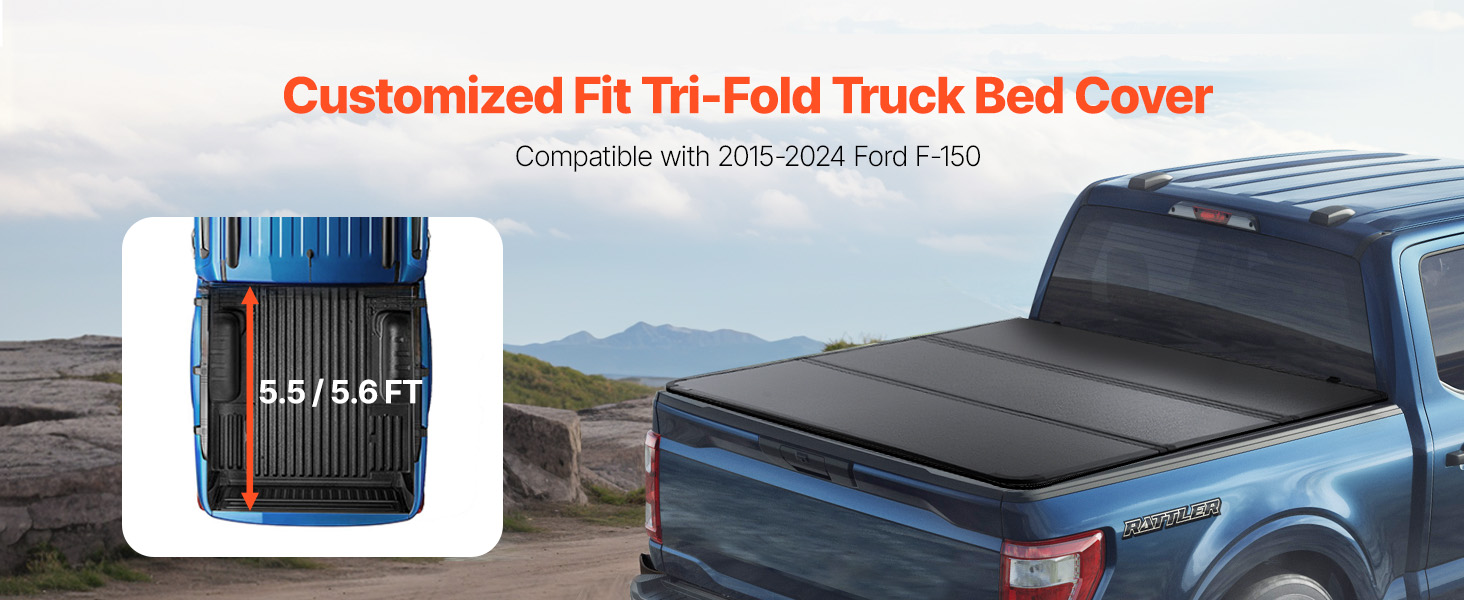 • Perfect Fit: This tri-fold truck bed cover is tailor-made for 2015-2024 Ford F-150, Lightning, Styleside 5.5' Bed, ensuring a snug fit for your truck bed measuring 5.6 x 5.4 ft (1704 x 1656 mm)/5.5 x 5.4 ft (1661 x 1656 mm). Note: Before you buy, just measure your bed to ensure compatibility with your vehicle.