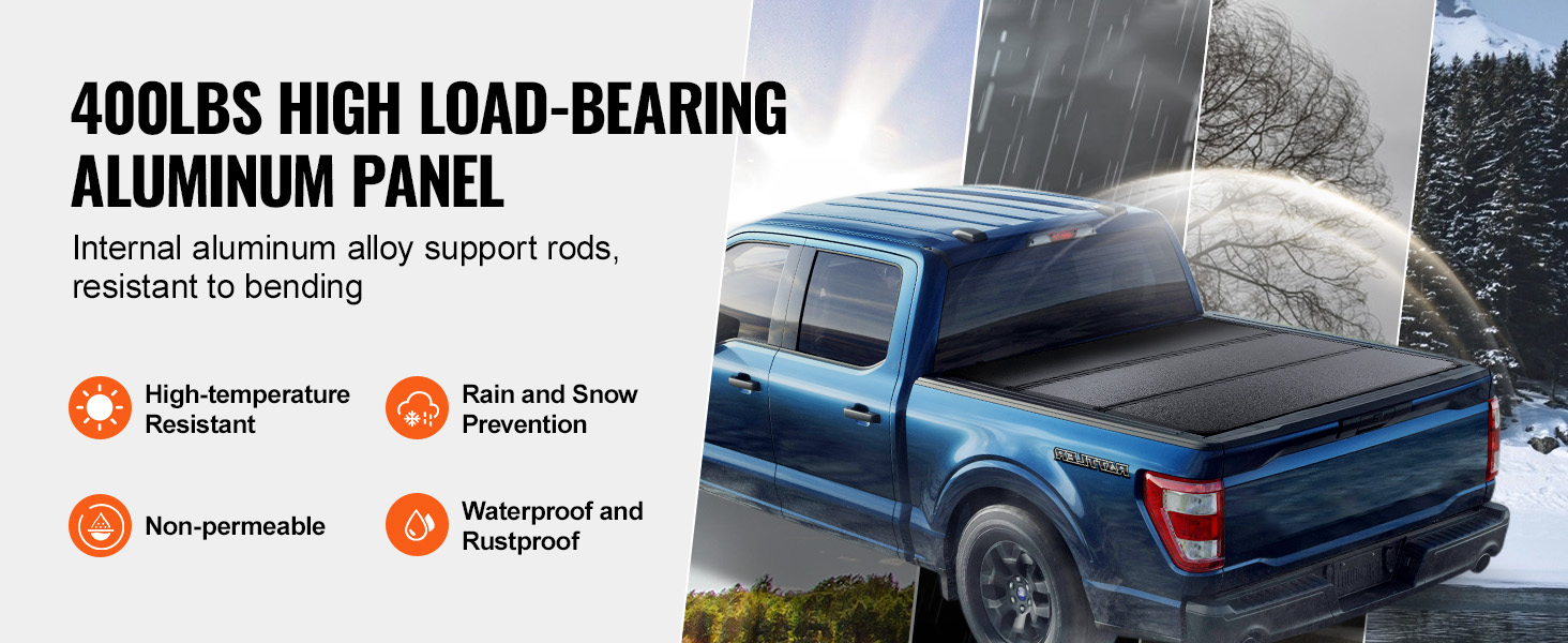 • Wind and Snow Resistant Aluminum Plate: Crafted with the heavy-duty aluminum alloy plate, this tonneau cover can handle up to 400 lbs/181.4 kg. Rain or shine, it's got you covered! Plus, waterproof cotton keeps everything dry inside. Internal aluminum alloy support bars resist rust and bend, avoiding water accumulation when unfolded flat.