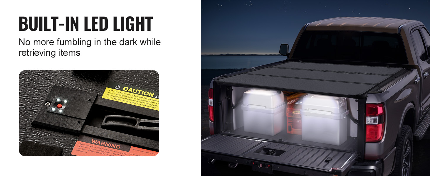 • LED Light & Quick Folding: Never fumble in the dark again with our built-in LED light! Grab what you need without the hassle of fully opening the pickup truck bed cover, day or night. And when you need extra space, simply fold it up into three sections for hassle-free access.