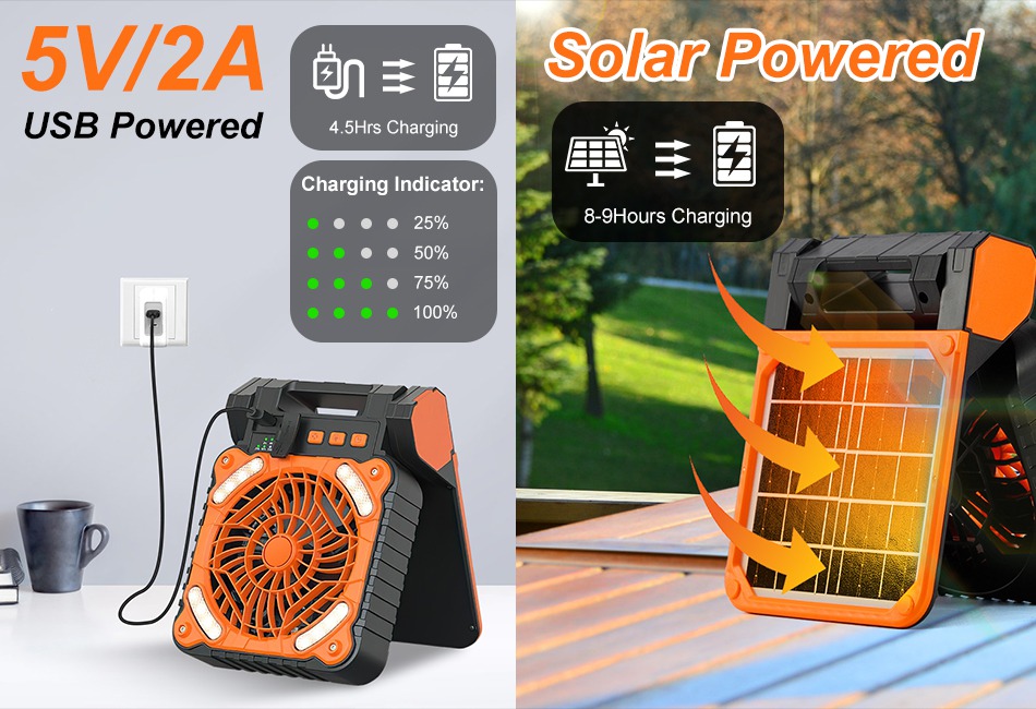 - Long Lasting Use & Dual Power Supply:This camping fan can be powered via USB or solar energy. Equipped with a built-in rechargeable 5200mAh battery,it offers up to 20 hours of refreshing airflow and provides up to 36 hours of illumination,ensuring you stay comfortable and well-lit during your outdoor adventures.