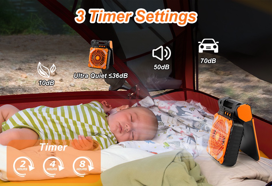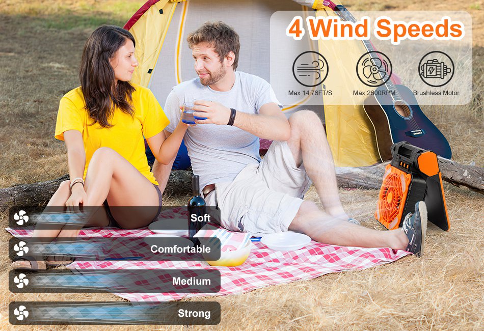 - 4 Wind Speeds & 3 Timer Settings:Built in a powerful brushless motor,this camping fan with light offers 4 speeds with up to 14.76 ft./s airflow. Additionally,it provides 3 timer settings for you to set at 2H/4H/8H,customizing your own time based on different needs.