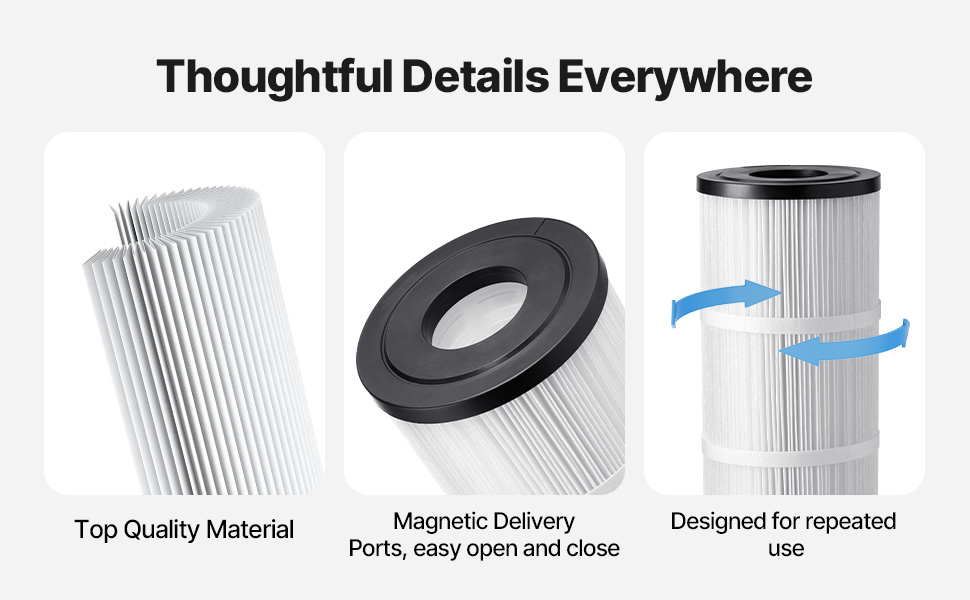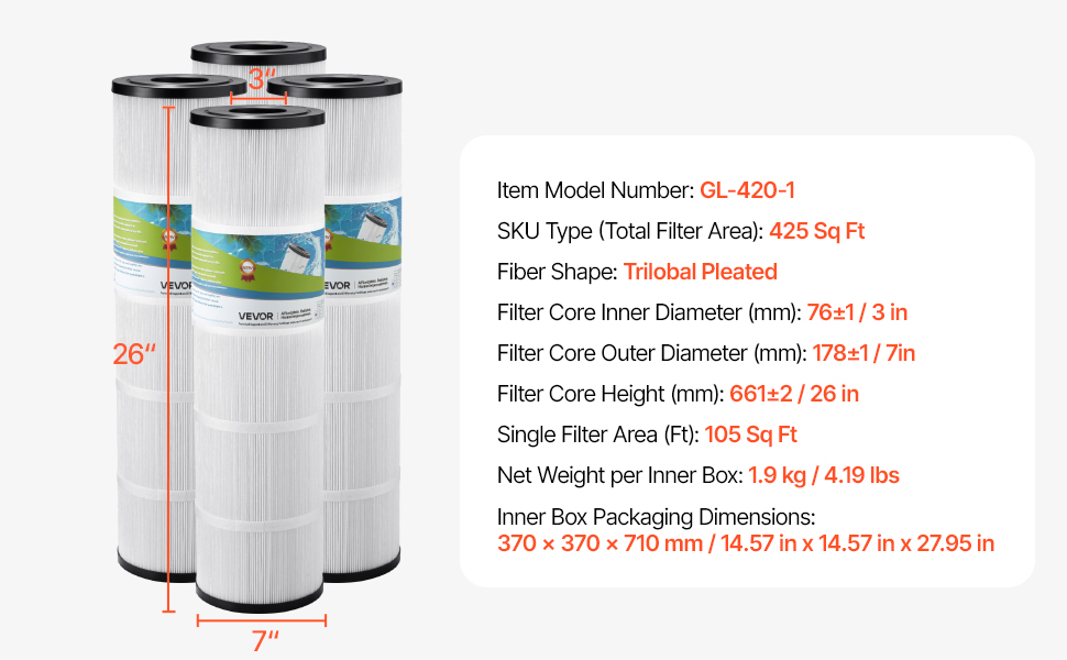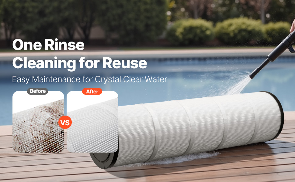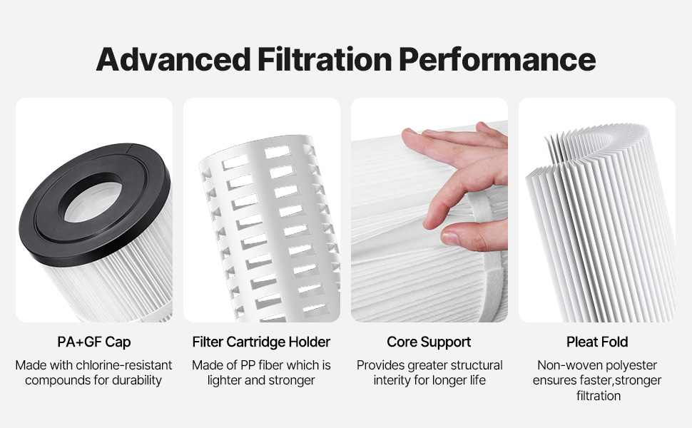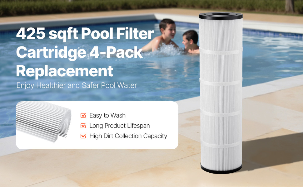 The 4 x 105 sq ft cartridge pool filter offers easy cleaning, long-lasting performance, and filtration. Its advanced design keeps your pool water crystal clear with a carbon fiber core and efficient pleats. Chlorine-resistant and energy-efficient, it ensures simple maintenance and lower costs.