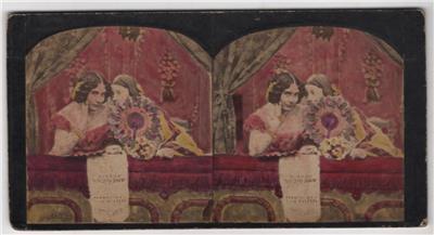 Civil War era genre stereoview showing two women in an Opera box gossiping with a playbill showing New Comedy American Cousin in bold, the play Lincoln was assassinated at.