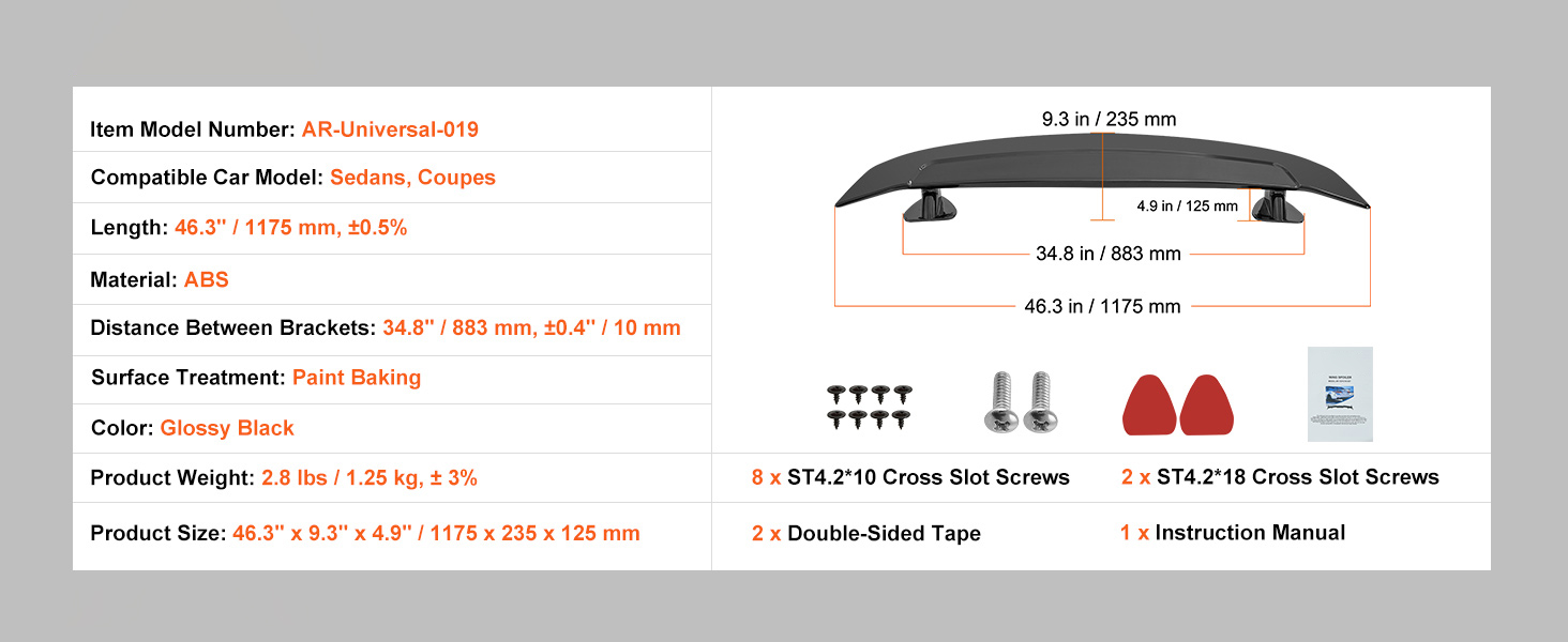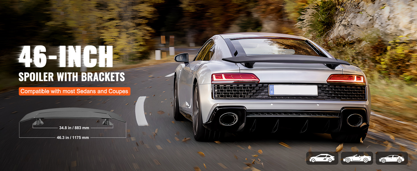 Universalspoiler: Unser Heckspoiler ist mit den meisten Limousinen & Coupés kompatibel, mit einer Standardspoilerlänge von 46,3" / 1175 mm und einem Abstand von 34,8" / 883 mm zwischen den beiden Halterungen. Sie müssen sich keine Sorgen machen, dass dieser Spoiler nicht zu Ihrem geliebten Auto passt.