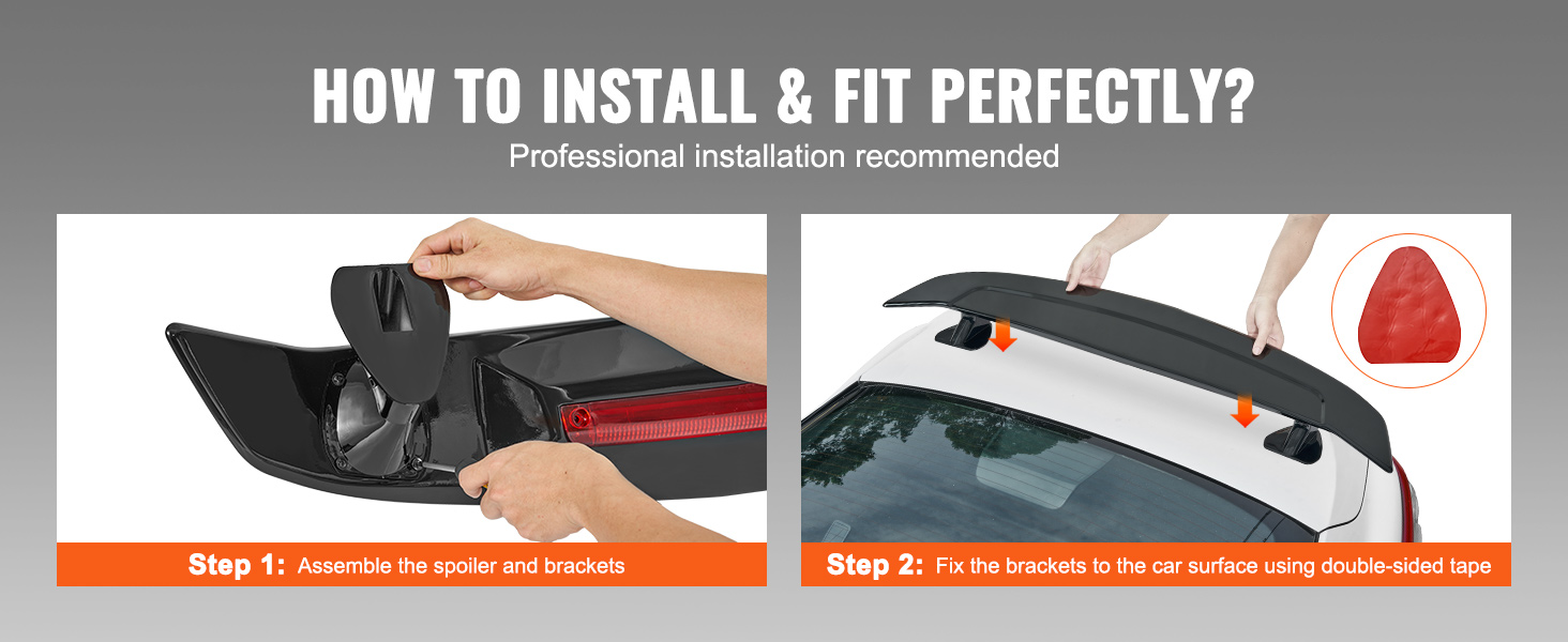 Nahtlose Installation: Dieser universelle Spoiler blockiert nicht die Kofferraumöffnung. Befestigen Sie die Halterungen mit starkem doppelseitigem Klebeband fest am Fahrzeug, ohne dass Sie bohren müssen. Der Klebstoff ist wasserfest und beständig gegen hohe und niedrige Temperaturen, sodass eine lang anhaltende Haftung gewährleistet ist. Stellen Sie vor dem Anbringen sicher, dass die Fahrzeugoberfläche sauber und ölfrei ist.
