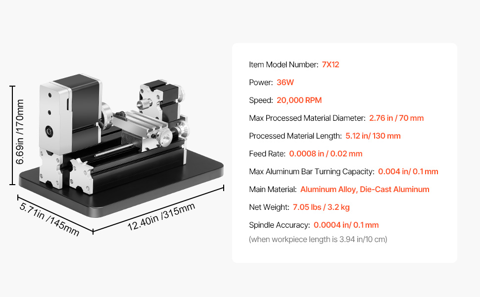 Precision Processing: With a maximum processed material diameter of 2.76 in / 70 mm and a material length capacity of 5.12 in / 130 mm, our power metal lathe handles a wide range of applications. It is ideal for processing small, intricate parts