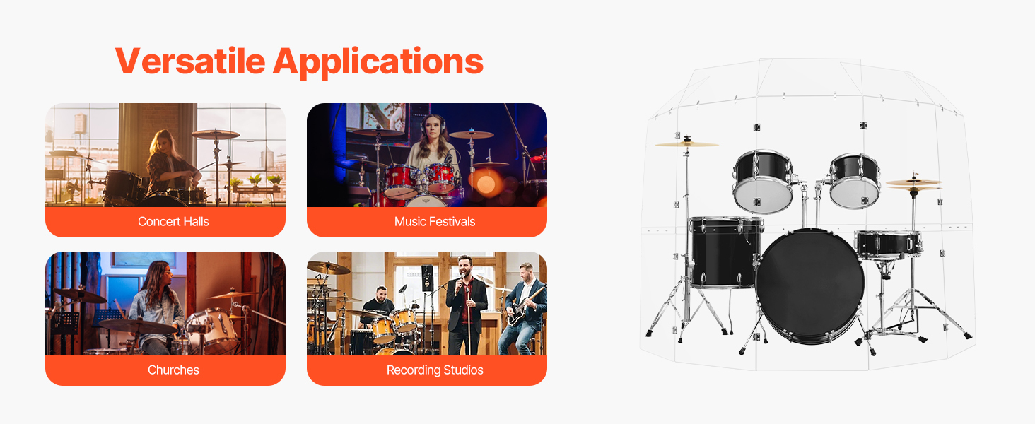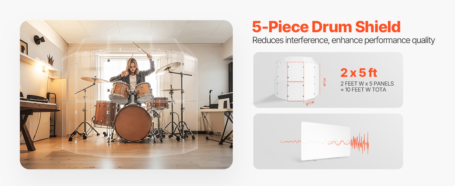 Egal, ob Sie professioneller Schlagzeuger oder Enthusiast sind, dieser Schlagzeugschutz verbessert Ihre Bühnenpräsenz und Klangqualität. Er reduziert Mikrofonstörungen, sodass Sie sich selbst deutlich hören können. Die Deflektoren und die 1,5 m lange Acrylplatte bieten vollständige Abdeckung, während Scharniere für Stabilität sorgen.