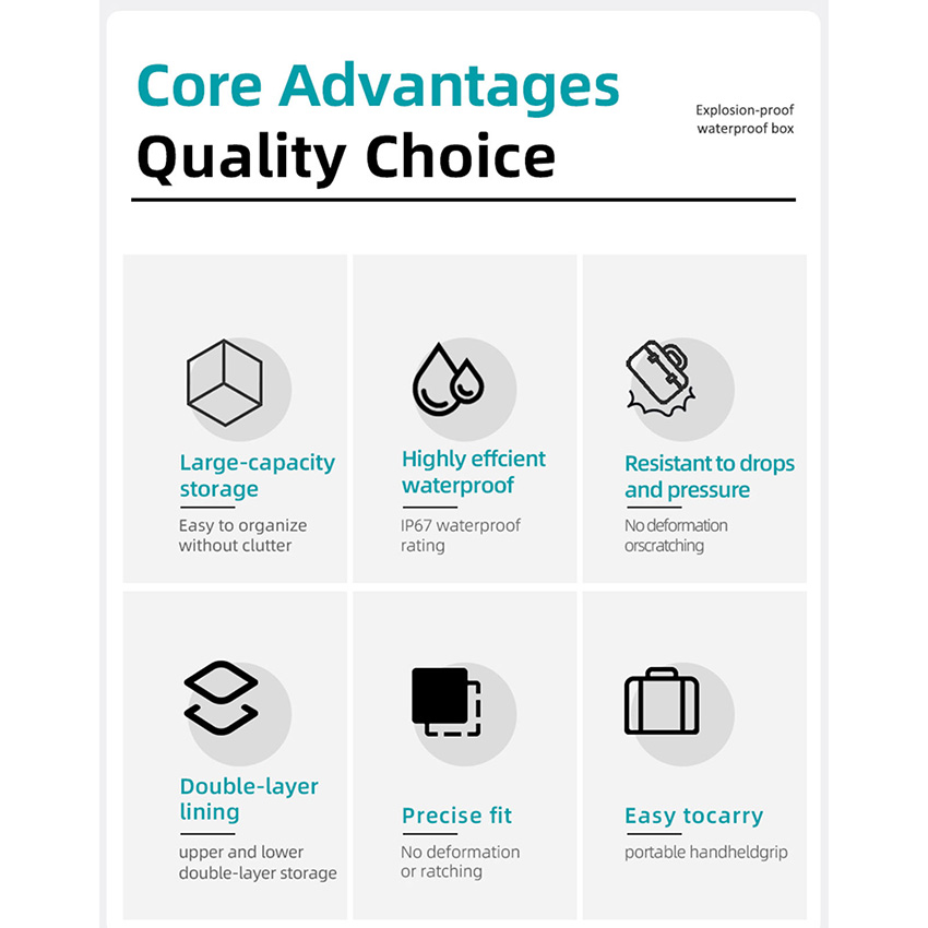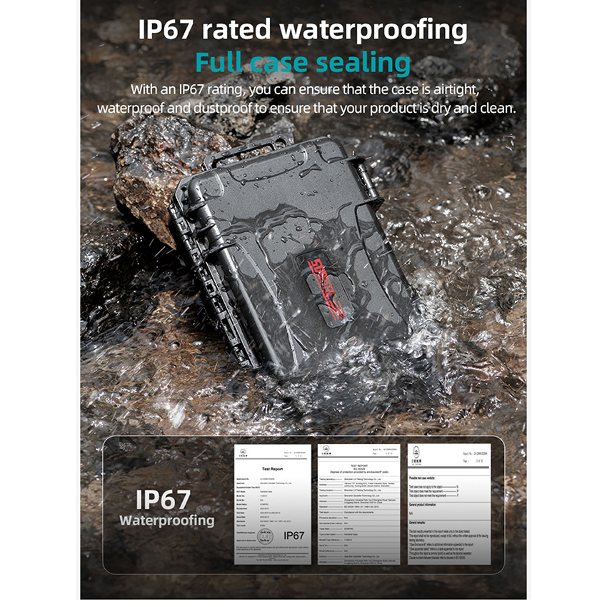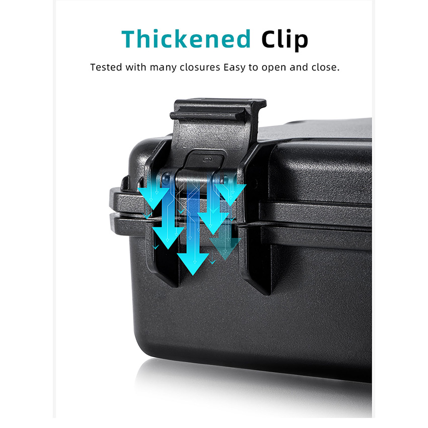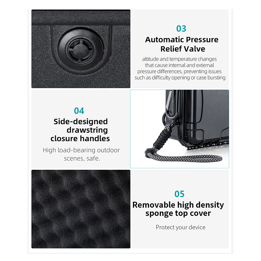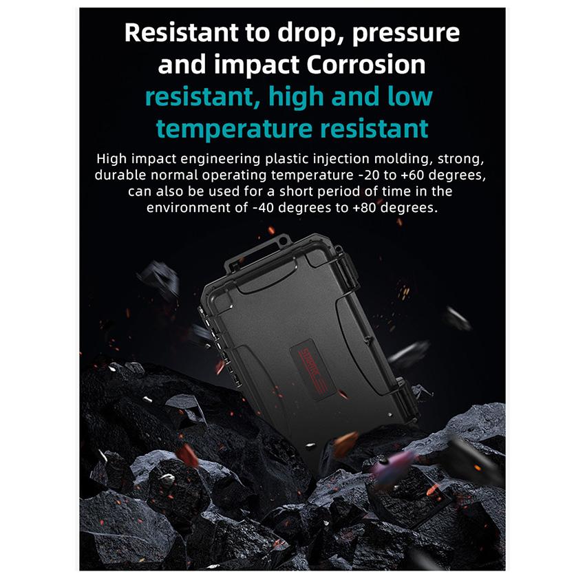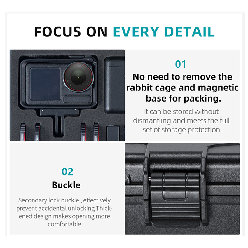 l The exterior is made of high-quality ABS material, wear-resistant and pressure-resistant, anti-collision and anti-drop, waterproof and dustproof, to ensure that your product is dry and clean; lined with customized hibiscus cotton material, as well as the top cover to increase the elastic sponge pad protection, can provide all-around protection for your Action series camera and related accessories