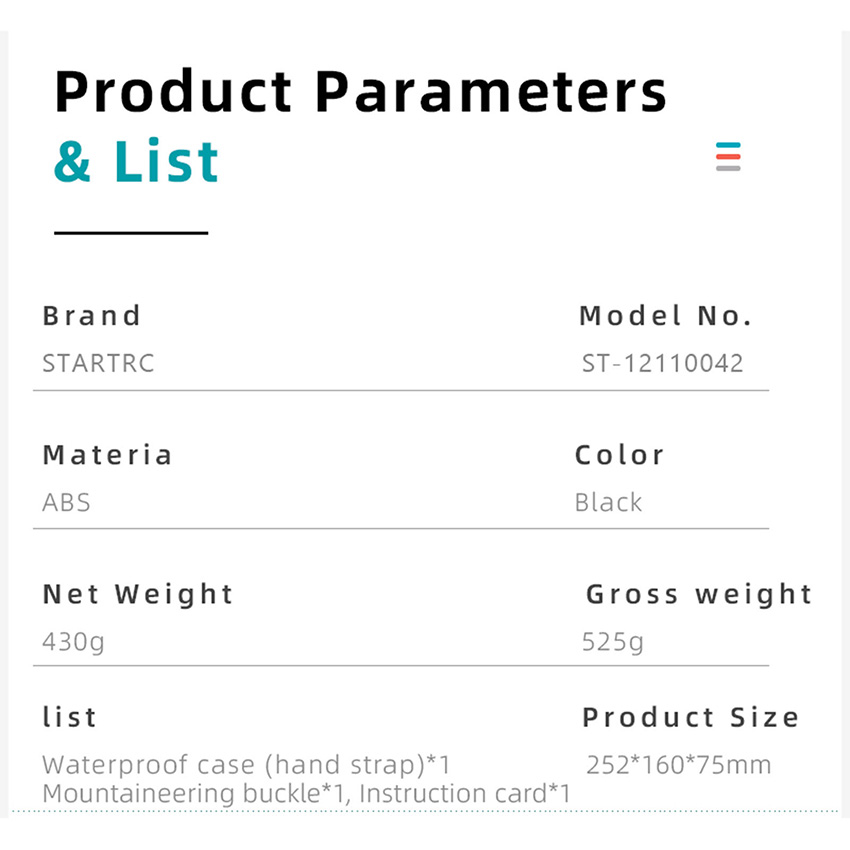 l 1x Waterproof Case (with Hand Lanyard), 1x Climbing Buckle, 1x Instruction Card