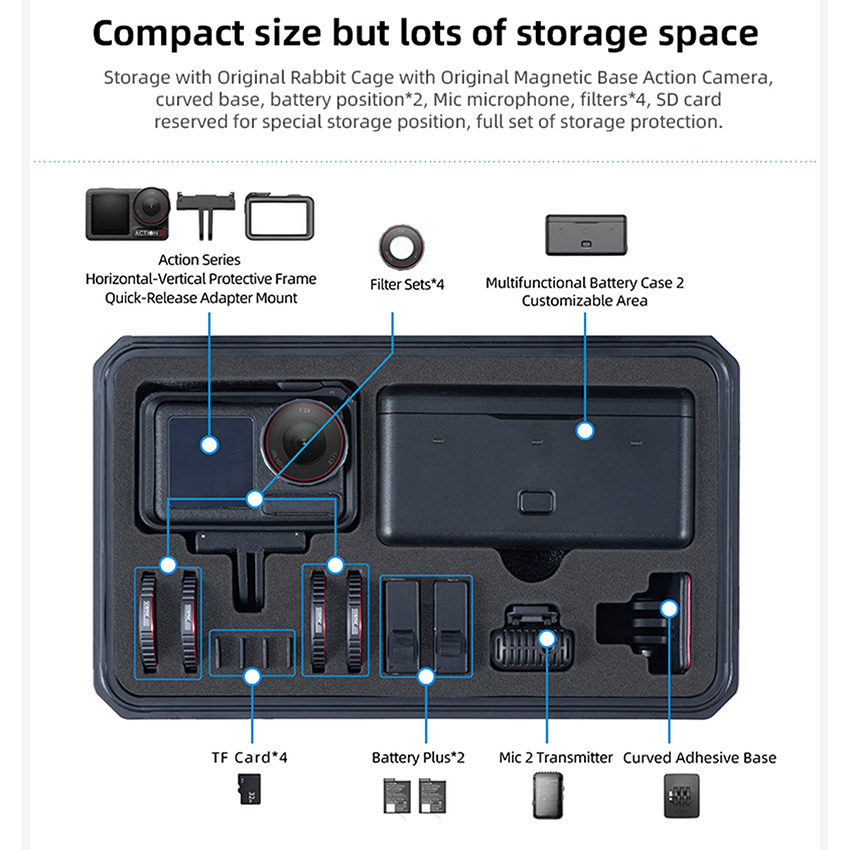l Small design of the mini-model waterproof case, can be stored with the original rabbit cage with the original magnetic base Action camera, curved base, battery position * 2, Mic microphone, the original charging compartment (the bottom of the can accommodate some data lines, screws; if you do not put the charging compartment, the whole can also be used as a customized space) and filters * 4, the SD card are reserved for a special storage position, to meet the full set of storage protection