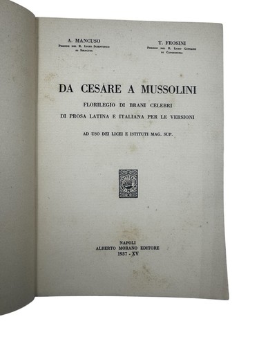 Raro volume del 1937 edito da Alberto Morano Editore, Da Cesare a Mussolini è un’antologia di brani celebri di prosa latina e italiana, pensata per l’uso scolastico nei licei e negli istituti magistrali superiori. Il libro offre una panoramica della letteratura classica e moderna attraverso selezioni di autori latini e italiani, coprendo un vasto arco storico che va dall’epoca di Giulio Cesare fino all’Italia fascista.